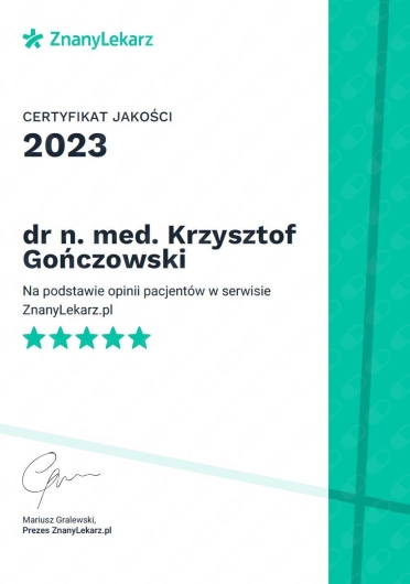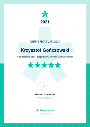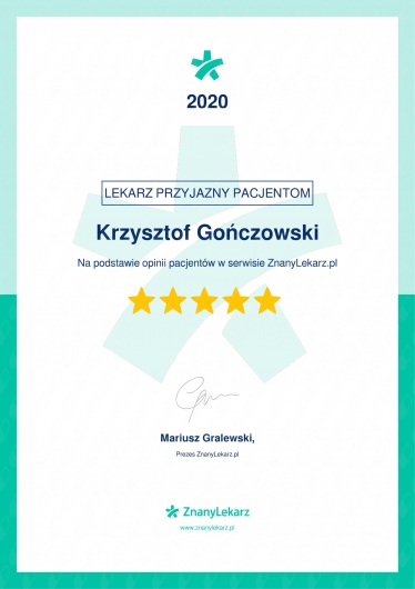 - Szybka dostępność terminów na wizytę konsultacyjną u dr Gończowskiego przez portal www.znanylekarz.pl, podczas której wykonywane jest badanie zęba, zdjęcia RVG i/lub CBCT (badanie 3D tomograficzne), kwalifikacja do ewentualnego leczenia kanałowego oraz bardzo szczegółowy kosztorys wszystkich planowanych zabiegów