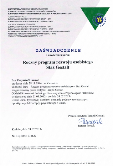 Jestem dyplomawanym psychologiem, psychoterapeutą Poznawczo - Behawioralnym z wykorzystaniem terapii schematów. Specjalizuję się w nurcie psychoterapii Poznawczo - Behawioralnej - jednym z najlepiej zbadanych i najskuteczniejszych podejść terapeutycznych w historii psychoterapii. Podczas spotkań pacjent pozna zależności między swoimi emocjami, myślami i zachowaniem. Materiałem wyjściowym do pracy na sesjach są zawsze konkretne sytuacje z życia. Odpowiadamy sobie na pytanie skąd trudności się wzięły i co możemy zrobić żeby polepszyć swoje życie, samopoczucie oraz postrzeganie siebie. Psychoterapia dedykowana jest zarówno osobom, które napotkały dylematy życiowe jak i tym, którzy odczuwają głębokie problemy psychiczne. Pracuję z osobami, które chcą nadać swojemu życiu lepszą jakość oraz poczuć większą satysfakcję płynącą z różnych sfer codziennego funkcjonowania. Prowadzę terapię i pomagam pacjentom w trudnościach i problemach dotyczących relacji z innymi ludźmi, zaburzeń emocjonalnych, niskiego poczucia własnej wartości, depresji, lęku, fobii, kryzysu, stresu, traumy, nadpobudliwości, bezsenności, zaburzeń zachowania, zaburzeń nerwicowych, PTSD, zaburzeń odżywiania, uzależnień. Studia magisterskie ukończyłem na Katolickim Uniwersytecie Lubelskim uzyskując dyplom psychologa. Podczas studiów ukończyłem staż kliniczny w Szpitalu Neuropsychiatrycznym im. prof. M. Kaczyńskiego w Lublinie. Kolejnym krokiem własnego doskonalenia wiedzy był roczny program edukacji psychologicznej i rozwoju osobistego w Instytucie Terapii Gestalt w Krakowie. Celem terapii Gestalt jest pomoc w poszukiwaniu i odkrywaniu swoich potrzeb, uczuć i emocji, aby móc działać w zgodzie ze sobą i w pełni korzystać z potencjału, który drzemie w każdym z nas. Obecnie swoje umiejętności i wiedzę teoretyczną doskonalę w Centrum Terapii Poznawczo - Behawioralnej współpracującym z Oxford Cognitive Therapy Centre. Kończę szkolenie w kierunku uzyskania Certyfikatu Psychoterapeuty Poznawczo - Behawioralnego Polskiego Towarzystwa Terapii Poznawczo - Behawioralnej (PTTPB). Dodatkowo swoje doświadczenie doskonaliłem pracując na Oddziale Psychiatrycznym w Szpitalu Specjalistycznym im. Ludwika Rydygiera w Krakowie. W pracy kieruje się Kodeksem Etyczno-Zawodowym Psychologa. Moja praca i jej jakość podlega ścisłej kontroli doświadczonych terapeutów i superwizorów PTTPB. W prywatnym życiu pasjonuję się fotografią, sztuką, nurkowaniem oraz podróżami. Nieustannie poszerzam swoją wiedzę i umiejętności aby jak najlepiej odpowiedzieć na potrzeby osób, z którymi pracuje. Ukończone kursy, szkolenia i warsztaty: • Wywiad i formułowanie przypadku w terapii poznawczo-behawioralnej • Identyfikowanie, weryfikowanie i modyfikowanie Negatywnych Automatycznych Myśli • Trening umiejętności: wywiad, sformułowanie przypadku, ustalanie celów, struktura sesji, praca domowa, informacje zwrotne, kluczowe treści poznawcze, trudności w terapii, cechy terapeuty • Identyfikowanie, weryfikowanie i modyfikowanie Dysfunkcyjnych Założeń • Terapia poznawczo-behawioralna depresji i myśli samobójczych • Lęk paniczny z i bez agorafobii w terapii poznawczo-behawioralnej • Zaburzenie obsesyjno-kompulsyjne i hipochondria • Terapia poznawczo-behawioralna w chorobach somatycznych i psychosomatycznych • Terapia poznawczo-behawioralna zespołu stresu pourazowego ( PTSD) • Gestalt a praca z ciałem • Praca z niską samooceną • Terapia poznawczo-behawioralna zaburzeń odżywiania • Lęk społeczny i uogólniony • Terapia poznawczo-behawioralna par • Terapia poznawczo-behawioralna dla grup • Wprowadzenie do zagadnień psychopatologii, diagnoza kliniczna (ICD-10) • Terapia poznawczo-behawioralna uzależnień • Wprowadzenie do Terapii Schematu • Dialog motywujący • Trening interpersonalny • Trening intrapsychiczny