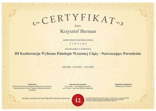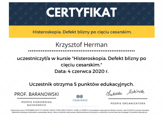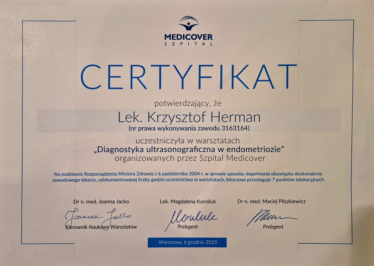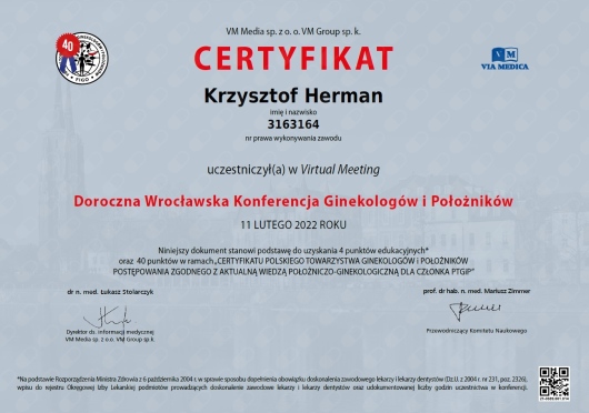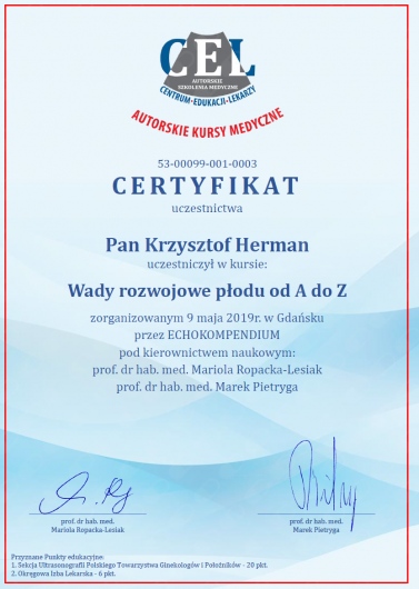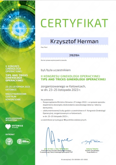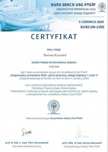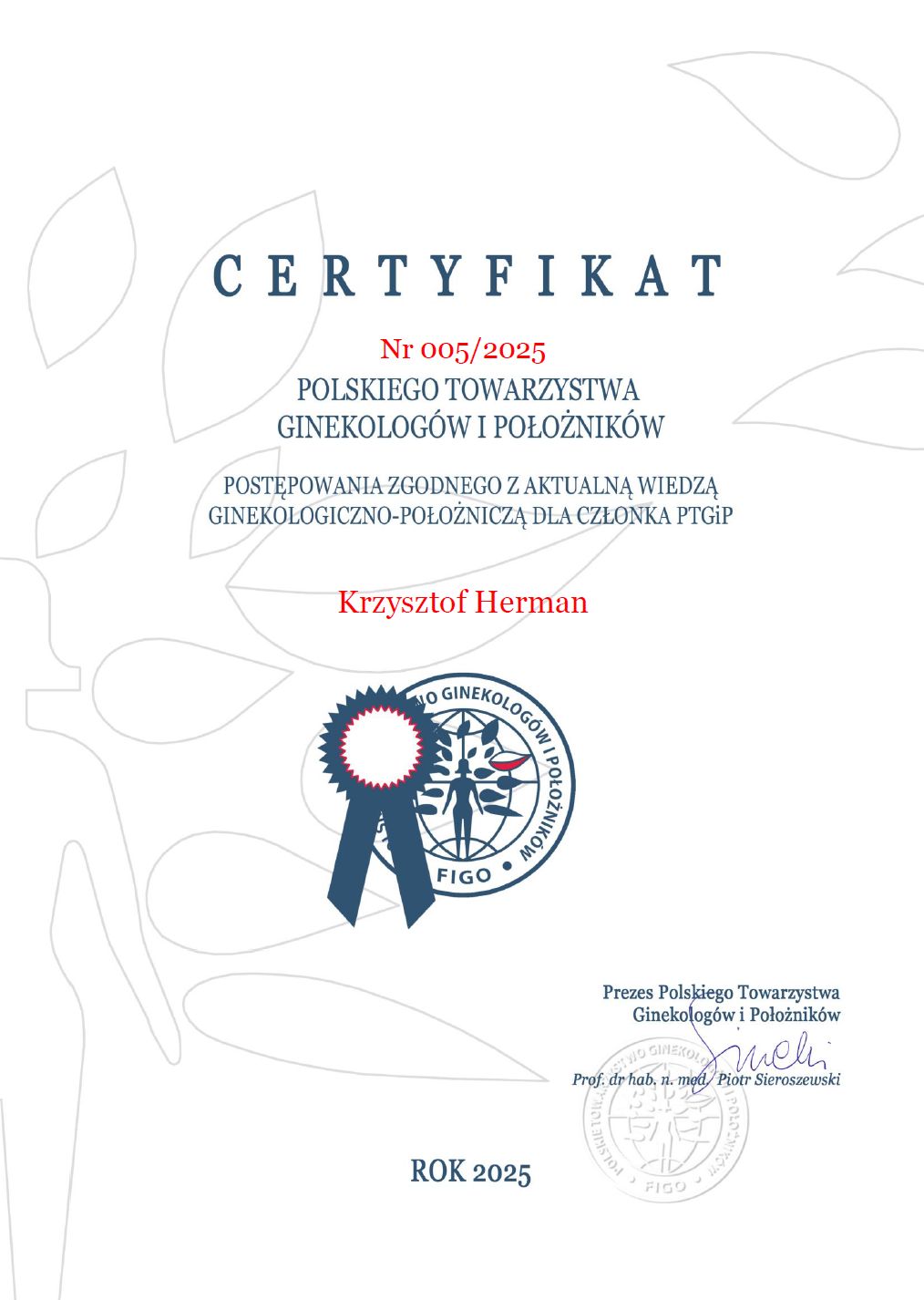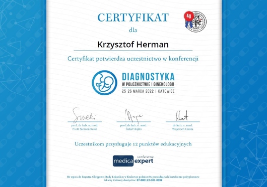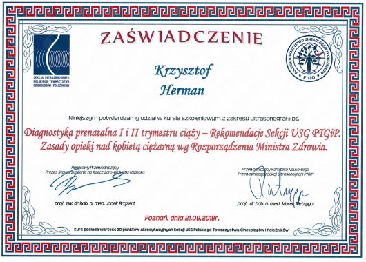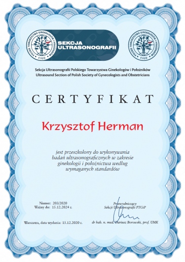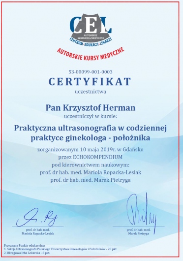 Absolwent Śląskiego Uniwersytetu Medycznego w Katowicach oraz Szkoły Głównej Handlowej w Warszawie. Na co dzień pracuje w renomowanym warszawskim ośrodku o III stopniu referencyjności. Doktorant w I Klinice Położnictwa i Ginekologii CMKP w Warszawie. Stale poszerza swoją wiedzę i umiejętności praktyczne uczestnicząc w specjalistycznych kursach i konferencjach. Posiada Certyfikat Sekcji Ultrasonografii PTGiP oraz grupy IOTA.
