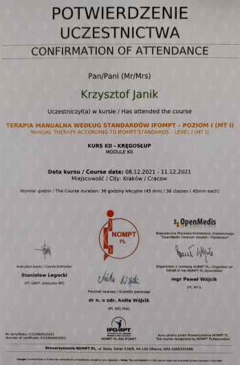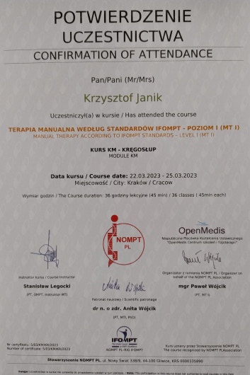 Pan Krzysztof jest profesjonalistą. Cechuje go przy tym wysoka kultura osobista, przyjazny stosunek do pacjenta. Jest cierpliwy, solidny i przede wszystkim skuteczny. Z uwagą wysłuchuje i stwarza komfortowe warunki do badania. Udziela dodatkowo rad, wskazówek dotyczących właściwych postaw itp. Gabinet nowoczesny, przyjemny z dużą ilością różnorodnych przyrządów. Zdecydowanie polecam.
