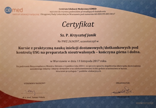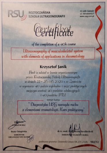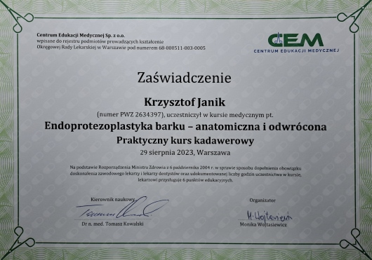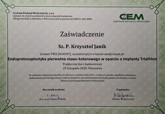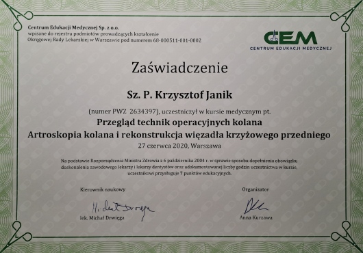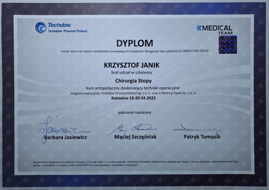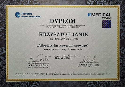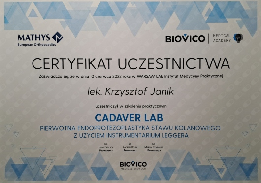 Odbyłem staże szkoleniowe w wiodących ośrodkach ortopedycznych w Polsce. Brałem udział w licznych kursach i szkoleniach na temat operacyjnego i zachowawczego leczenia schorzeń narządu ruchu.