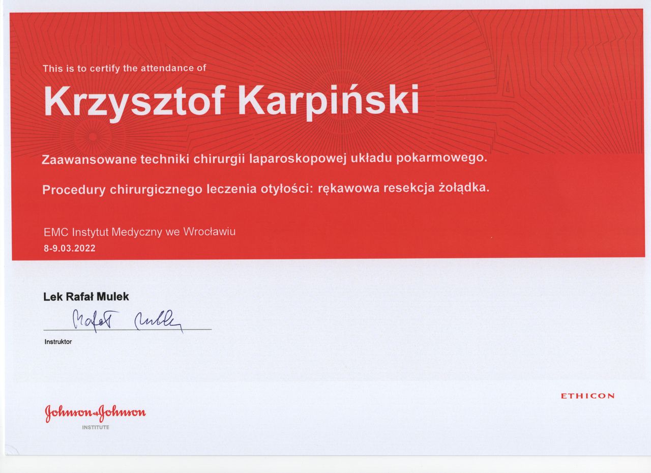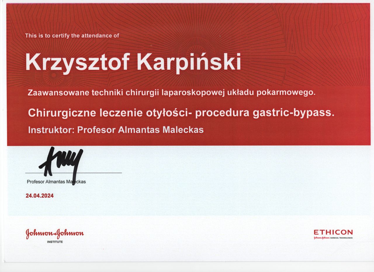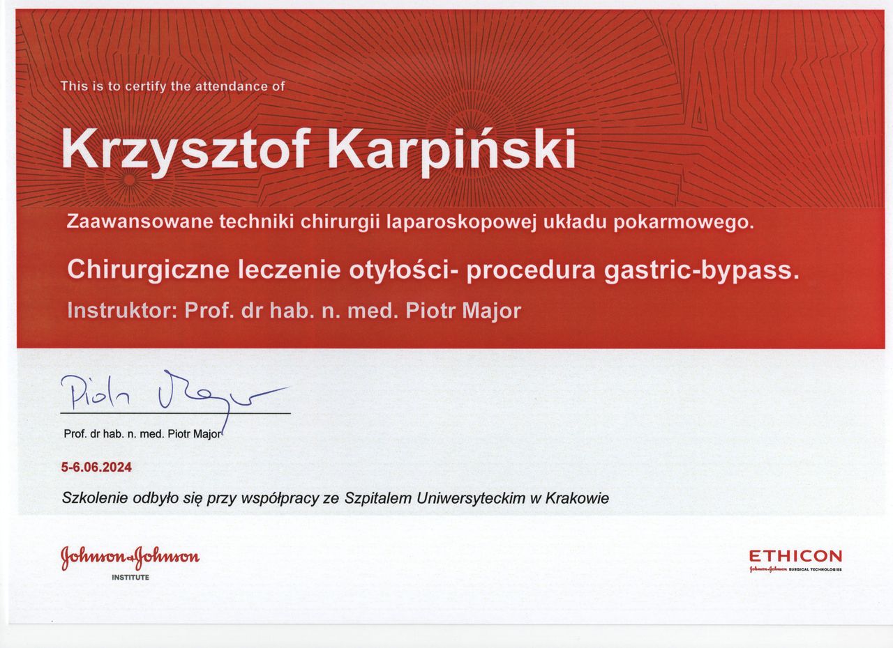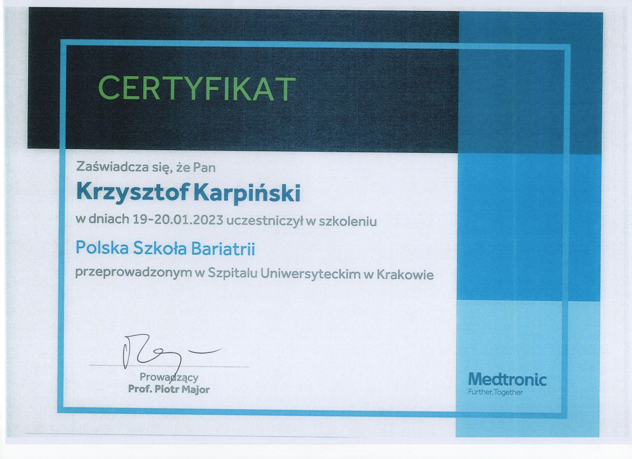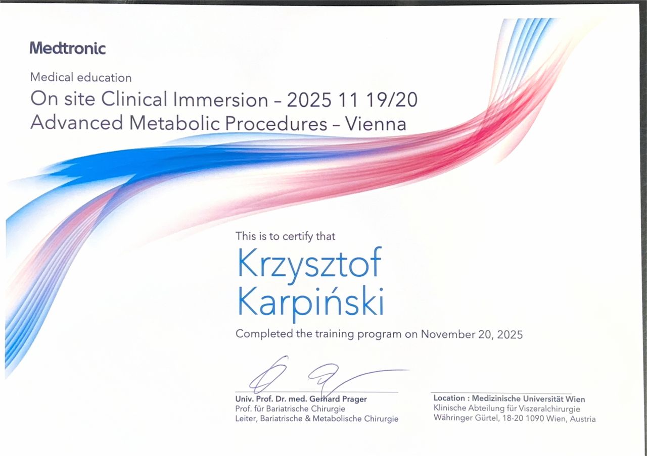 Lekarz systematycznie poszerza swoją wiedzę, uczestnicząc w licznych szkoleniach i konferencjach krajowych oraz zagranicznych, poświęconych chirurgicznemu leczeniu otyłości.