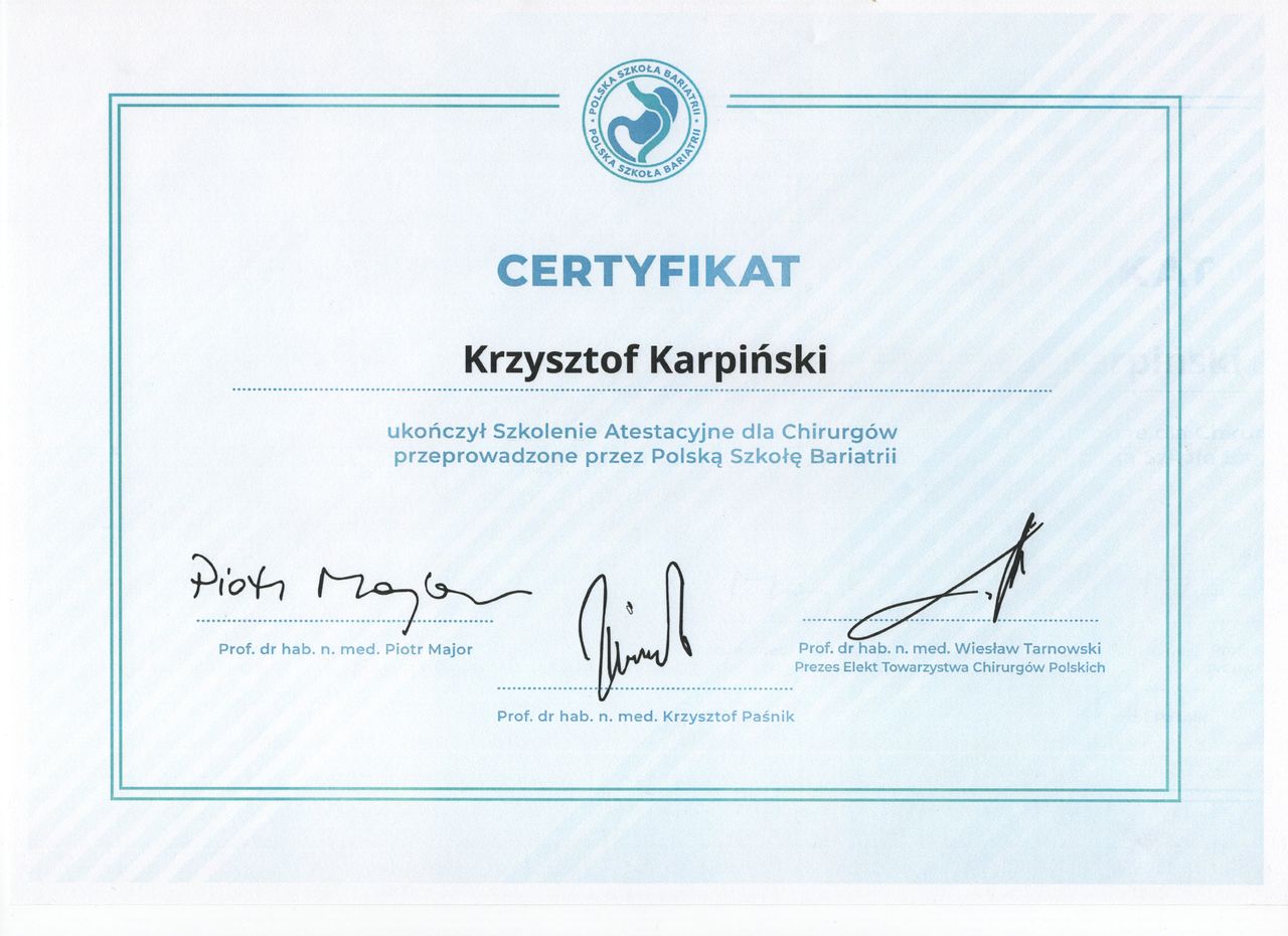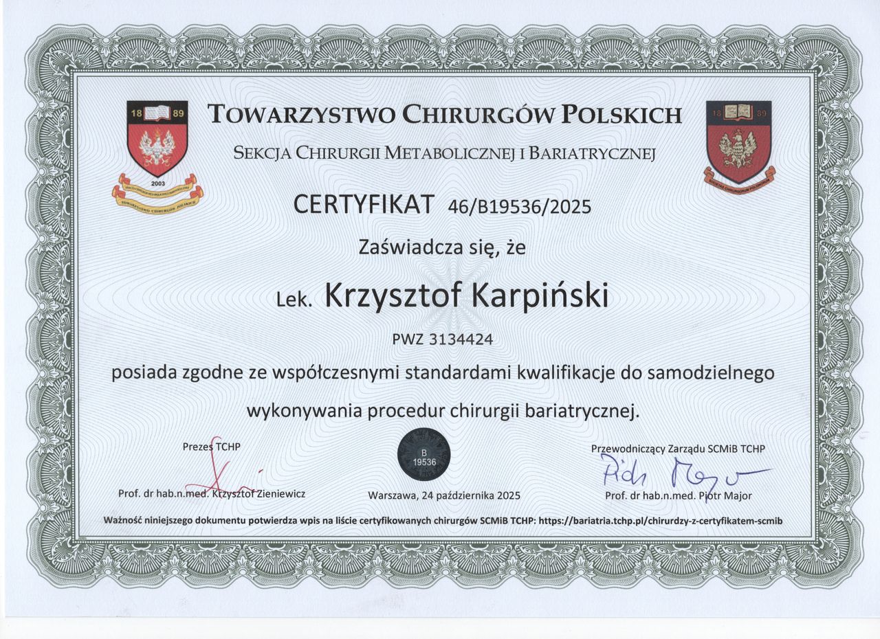 Lekarz specjalista chirurgii ogólnej, chirurg bariatra certyfikowany przez SCMiB