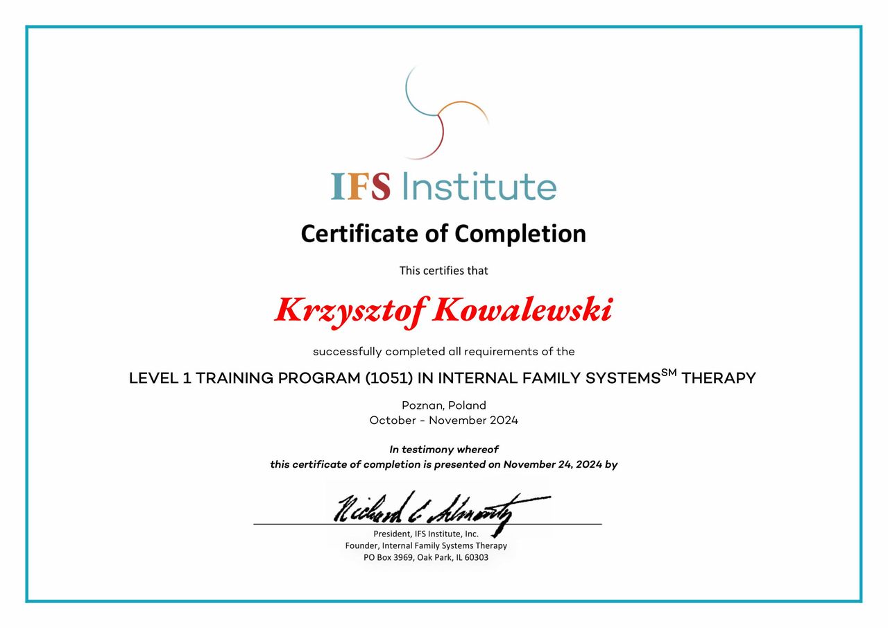 Jestem dyplomowanym psychologiem, certyfikowanym terapeutą EMDR (poziom 1 i 2), certyfikowanym terapeutą IFS (level 1), oraz psychoterapeutą w procesie certyfikacji w Szkole Psychoterapii Poznawczo Behawioralnej Interego w Warszawie, rekomendowanej przez Polskie Towarzystwo Terapii Poznawczej i Behawioralnej.