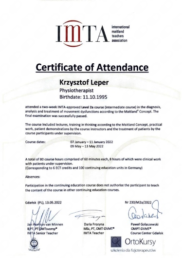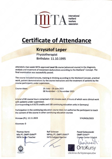 Pan Krzysztof jest znakomitym fizjoterapeutą. Ogromna wiedza, zaangażowanie i trafność w diagnozie. Lekarze od trzech lat nie umieli mi pomóc w bólu. Efekt po pierwszej wizycie. Jestem zachwycona Panem Krzysztofem i bardzo go polecam osobom które zmagają się z bólem.