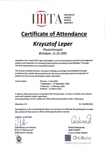Główne metody mojej pracy z pacjentem to terapia manualna według Koncepcji Maitland, masaż tkanek głębokich, terapia punktów spustowych oraz suche igłowanie i pinoterapia. Dodatkowo uzupełnieniem każdej mojej terapii jest także szeroko pojęty trening medyczny.