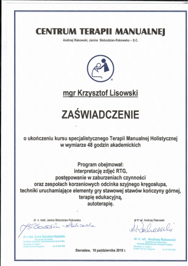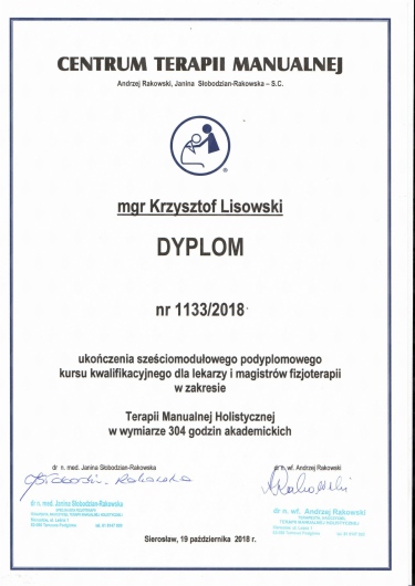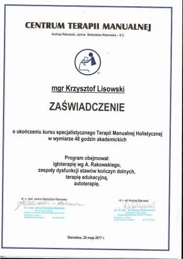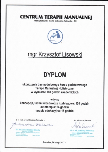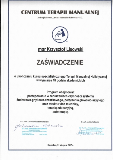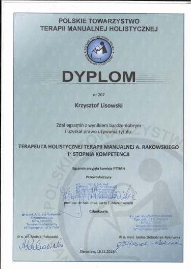 Jestem specjalistą Terapii Manualnej Holistycznej, zajmuję się m.in terapią dna miednicy, leczeniem stawów skroniowo - żuchwowych i leczeniem bólu psychogennego wynikającego z napięcia i stresu.