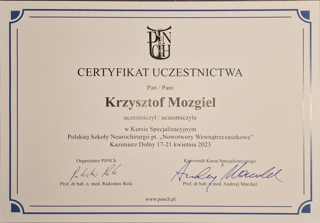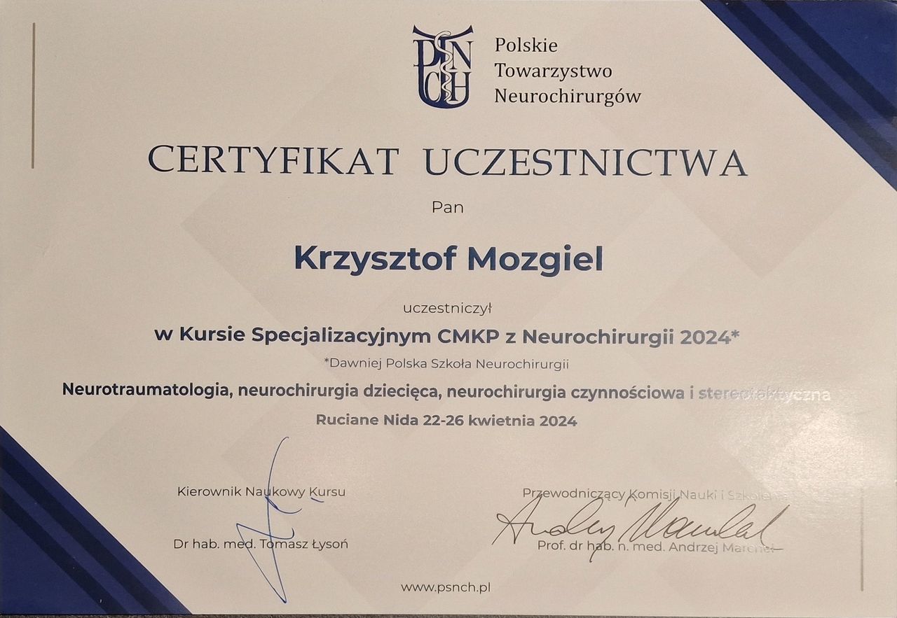 Jaki jest zakres porad oferowanych przez Krzysztof Mozgiel?Krzysztof Mozgiel to neurochirurg. Na podstawie swojego doświadczenia i wykształcenia Krzysztof Mozgiel oferuje usługi takie jak: Kriolezja leczenie bólu, Terapia osoczem bogatym w czynniki wzrostu- PRP, Terapia Kwasem Hialuronowym, konsultacja neurochirurgiczna.