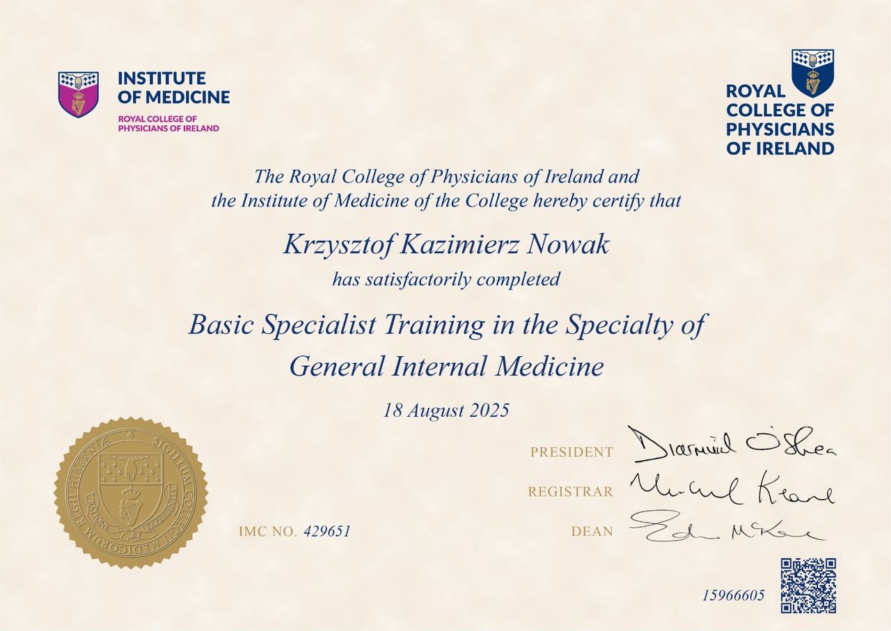 Przed rozpoczęciem specjalizacji z psychiatrii ukończyłem szkolenie specjalizacyjne z chorób wewnętrznych (Basic Specialist Training in Internal Medicine) w Mater Hospital w Dublinie, co pozwala mi patrzeć na zdrowie psychiczne w ścisłym powiązaniu ze stanem somatycznym pacjenta. Pracuję zgodnie z zasadami medycyny opartej na faktach (EBM), współpracuję z psychoterapeutami oraz regularnie podnoszę swoje kwalifikacje, uczestnicząc w szkoleniach i konferencjach naukowych.