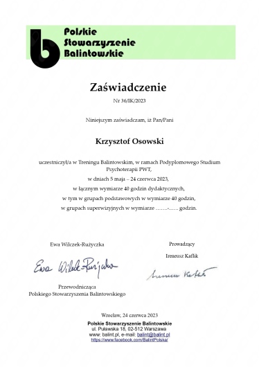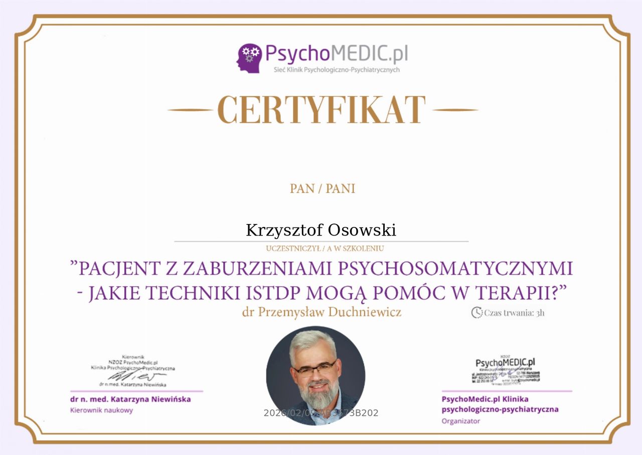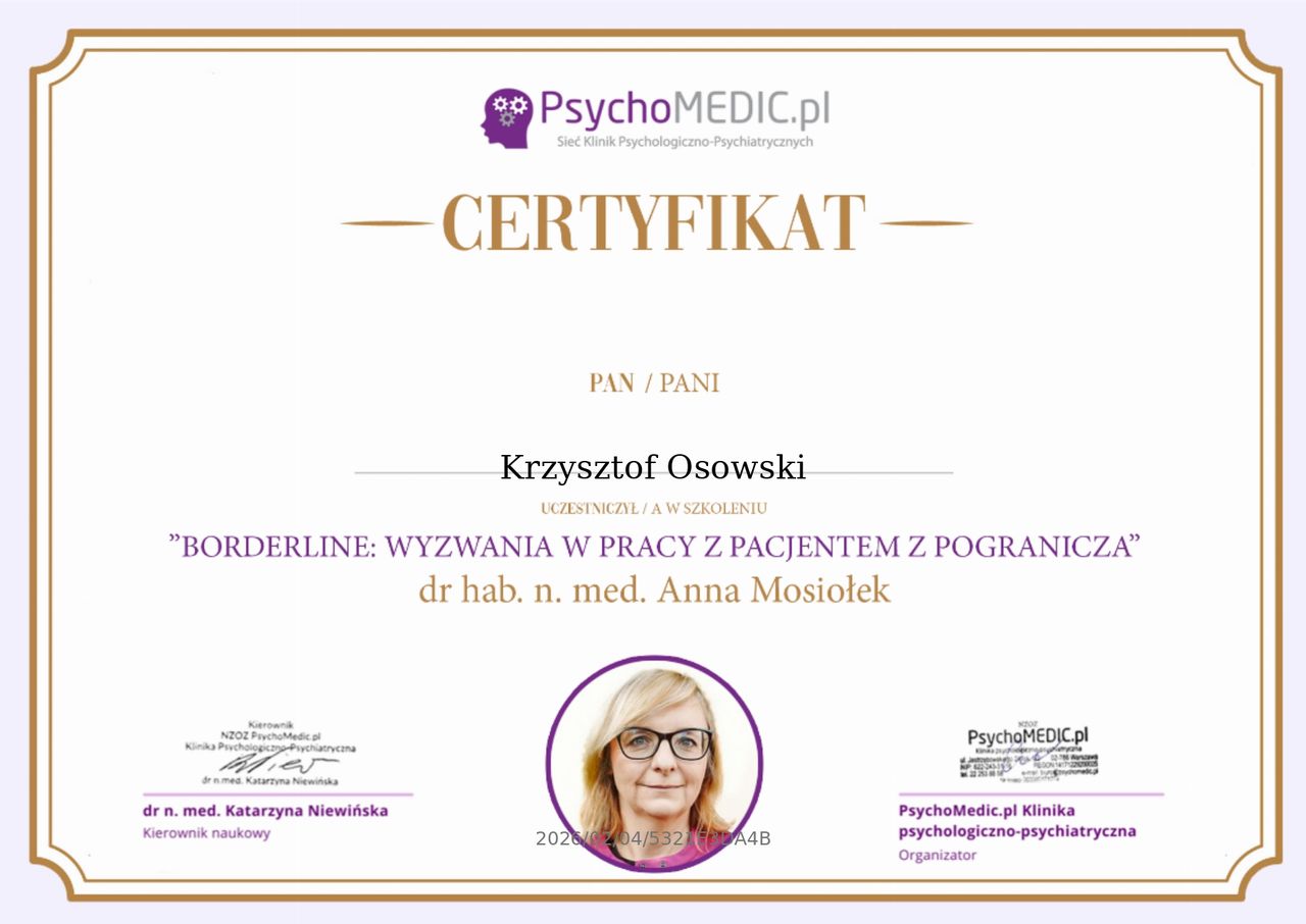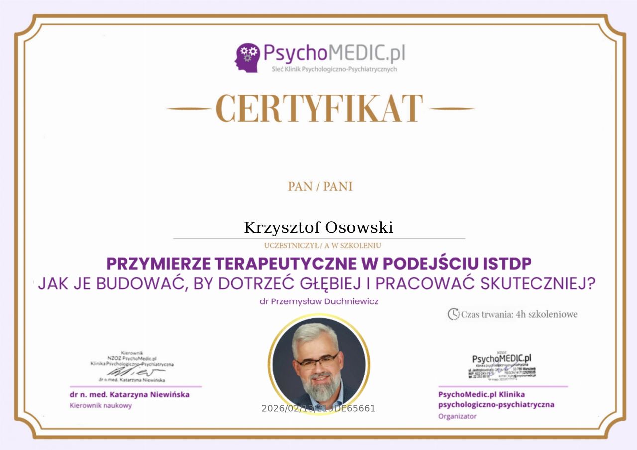 Życie bywa nieprzewidywalne i czasem rzuca nas w miejsca, w których czujemy się zagubieni, pozbawieni sił i nadziei. W moim przypadku był to bardzo trudny okres - pełen wątpliwości, rozczarowań i bólu, który wydawał się nie do udźwignięcia. Zmagałam się z różnymi problemami, wewnętrznymi, jak i tymi, które przynosiło codzienne życie. Czułam, że stoję w miejscu, że tracę siebie i że nie wiem gdzie dalej ruszyć. Na mojej drodze pojawił się jednak ktoś kto pomógł mi odnaleźć światło w tym mroku - Pan Krzysztof Osowski. Terapia, którą rozpoczęłam okazała się punktem zwrotnym - miejscem gdzie mogłam bez lęku mówić o swoich emocjach, obawach, nie bojąc się oceny czy niezrozumienia. To, co kiedyś wydawało się niemożliwe, teraz staje się realne. Nie byłoby to możliwe bez cierpliwości, empatii i profesjonalizmu terapeuty, który towarzyszył mi na tej drodze. Jestem ogromnie wdzięczna za pomoc i wsparcie. To doświadczenie pokazało mi, że warto o siebie walczyć, a zmiana jest możliwa.