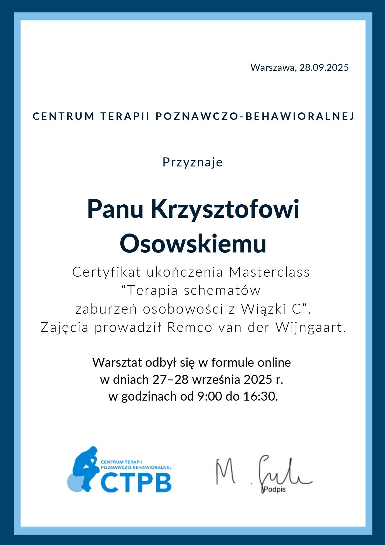 Myślę, że już mogę wyrazić swoją opinię, jestem w trakcie terapii u Pana Krzysztofa. Nikt nie mógł mi pomóc po ogromnej traumie, niejeden psycholog, terapeuta…nikt nie był tak skuteczny jak Pan Krzysztof, proszę mi wierzyć, że mam porównanie i wiem o czym piszę.