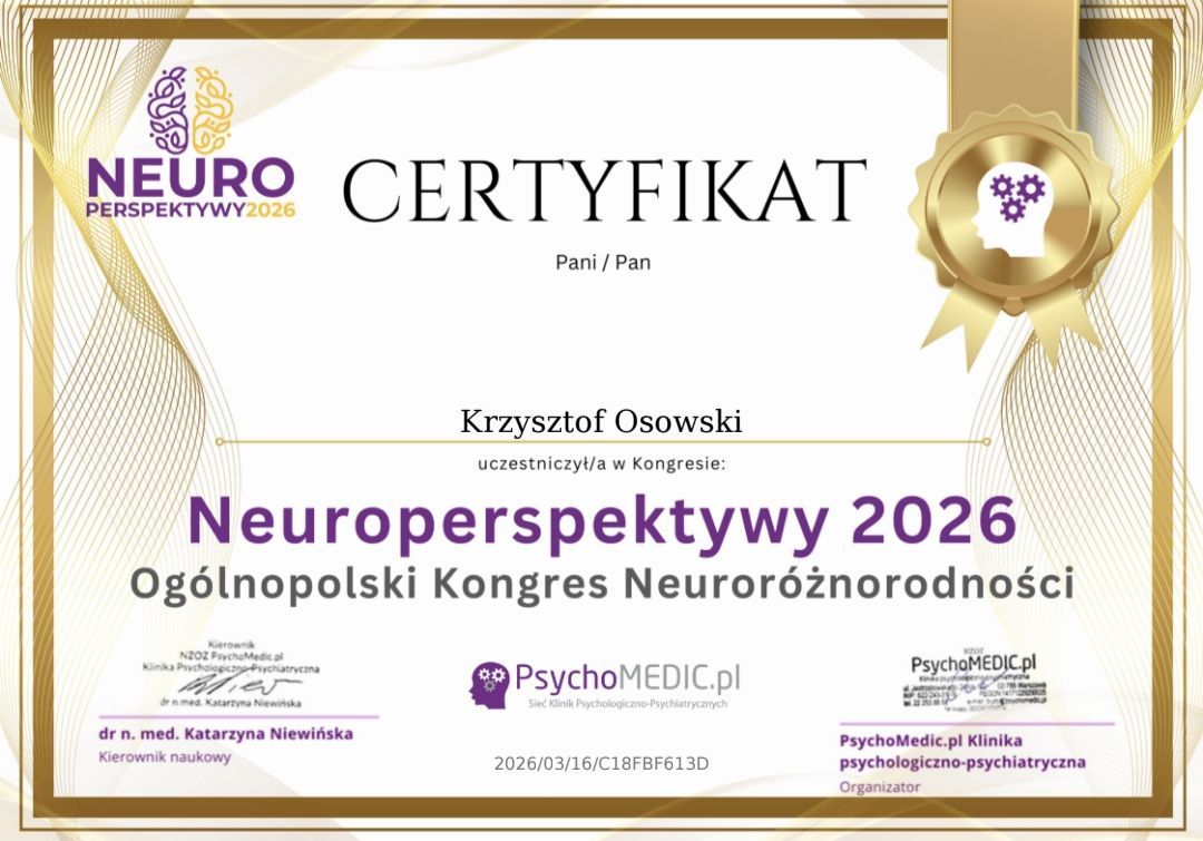 Pan Krzysztof od samego początku wykazywał się ogromną uważnością, empatią i zrozumieniem. Czułam, że naprawdę mnie słucha i moje problemy są traktowane poważnie. Dzięki naszej pracy nauczyłam się radzić sobie ze stresem i odzyskałam spokój w codziennym funkcjonowaniu zawodowy oraz prywatnym. Terapia była dla mnie bardzo dużym wsparciem i realnie pomogła mi w trudnym okresie. Z całego serca polecam Pana Krzysztofa jest to profesjonalny, zaangażowany i godny zaufania psychoterapeuta, który pogama w terapi online oraz w swoim prywatnym gabinecie (Gorzów Wielkopolski)• Krzysztof Osowski, Psychoterapia online • •