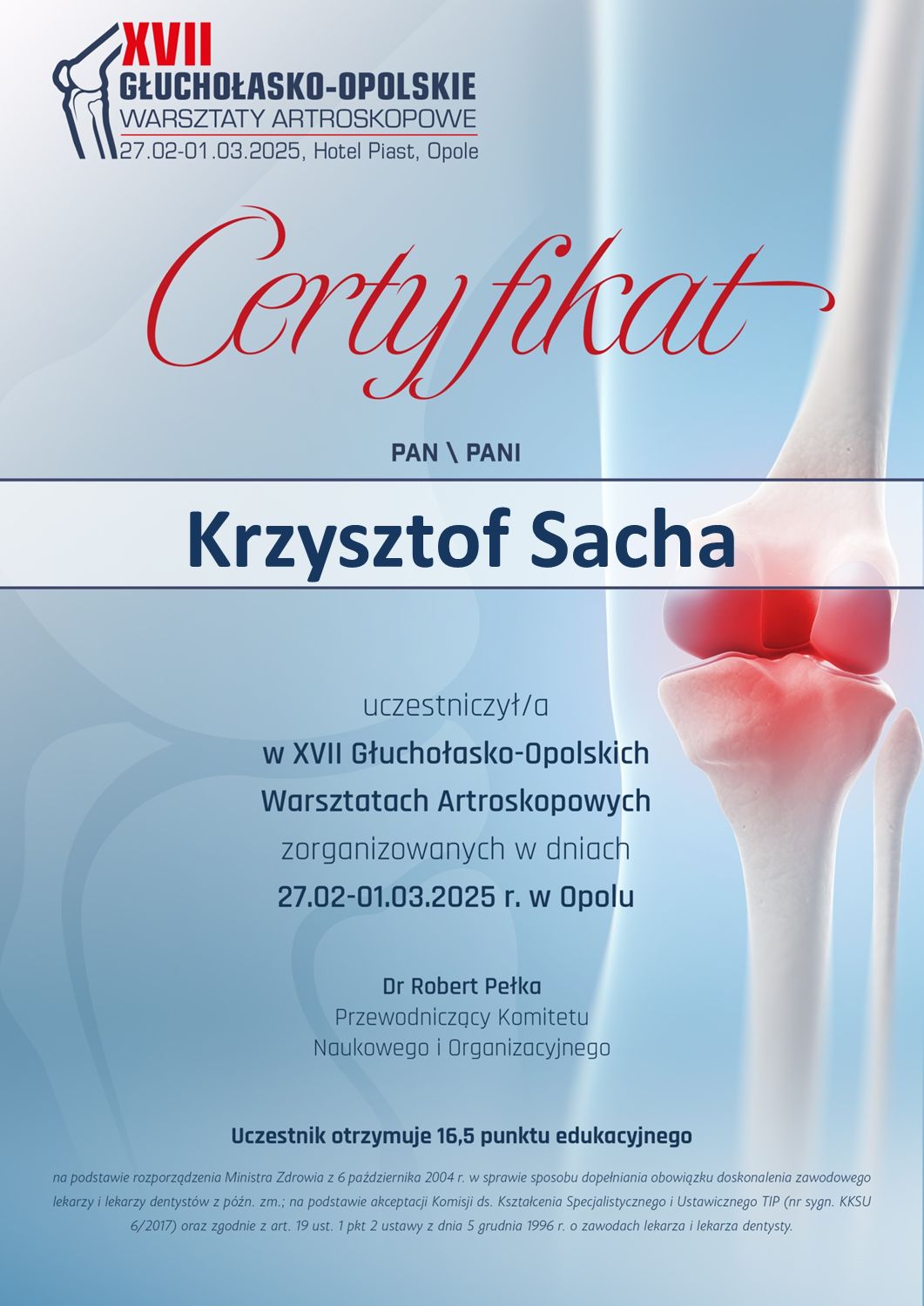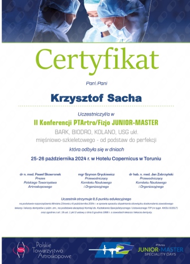 9 maja podczas XLI konferencji Ortopedów Wojska Polskiego wygłosiłem prezentację pt. "Operacyjne leczenie zaburzeń zrostu złamań okołoprotezowych stawu kolanowego z zastosowaniem endoprotez poresekcyjnych" autorstwa zespołu Kliniki w której pracuję.