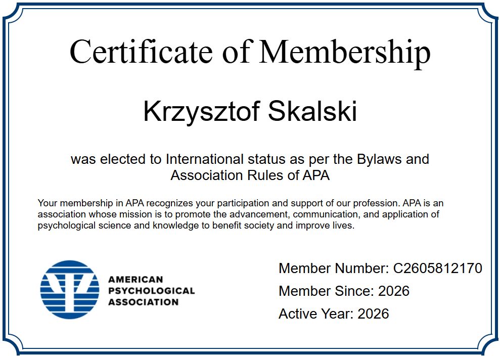 Jaki jest zakres porad oferowanych przez Krzysztof Skalski?Krzysztof Skalski to psycholog. Na podstawie swojego doświadczenia i wykształcenia Krzysztof Skalski oferuje usługi takie jak: Konsultacja psychologiczna, Sporządzanie opinii, testy psychologiczne, badanie osobowości z opinią, Badanie funkcji poznawczych, diagnoza ADHD dla dorosłych, diagnoza depresji, ADHD Diagnostic test in english, Diagnoza zaburzeń osobowości - SCID-5-PD, Diagnoza ADHD młodzieży.