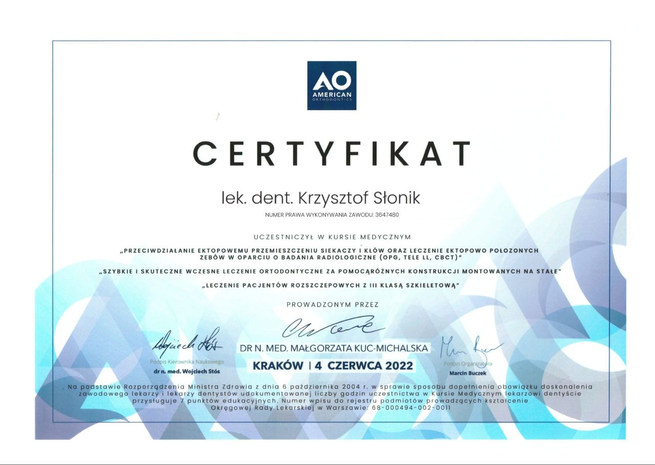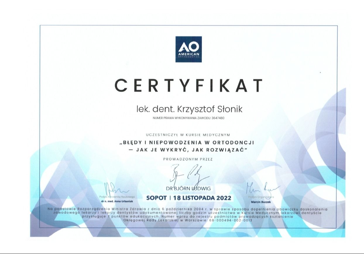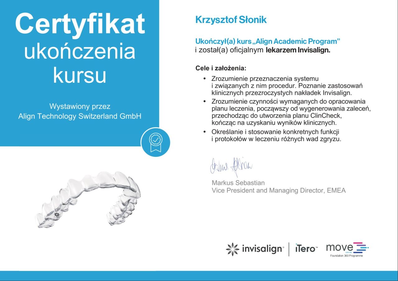 Jaki jest zakres porad oferowanych przez Krzysztof Słonik?Krzysztof Słonik to ortodonta. Na podstawie swojego doświadczenia i wykształcenia Krzysztof Słonik oferuje usługi takie jak: konsultacja ortodontyczna, Konsultacja Invisalign.
