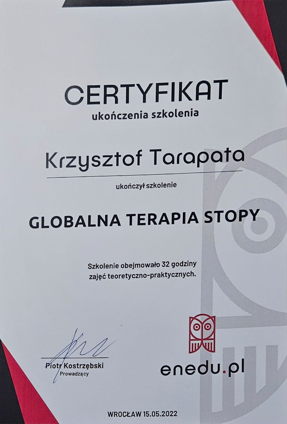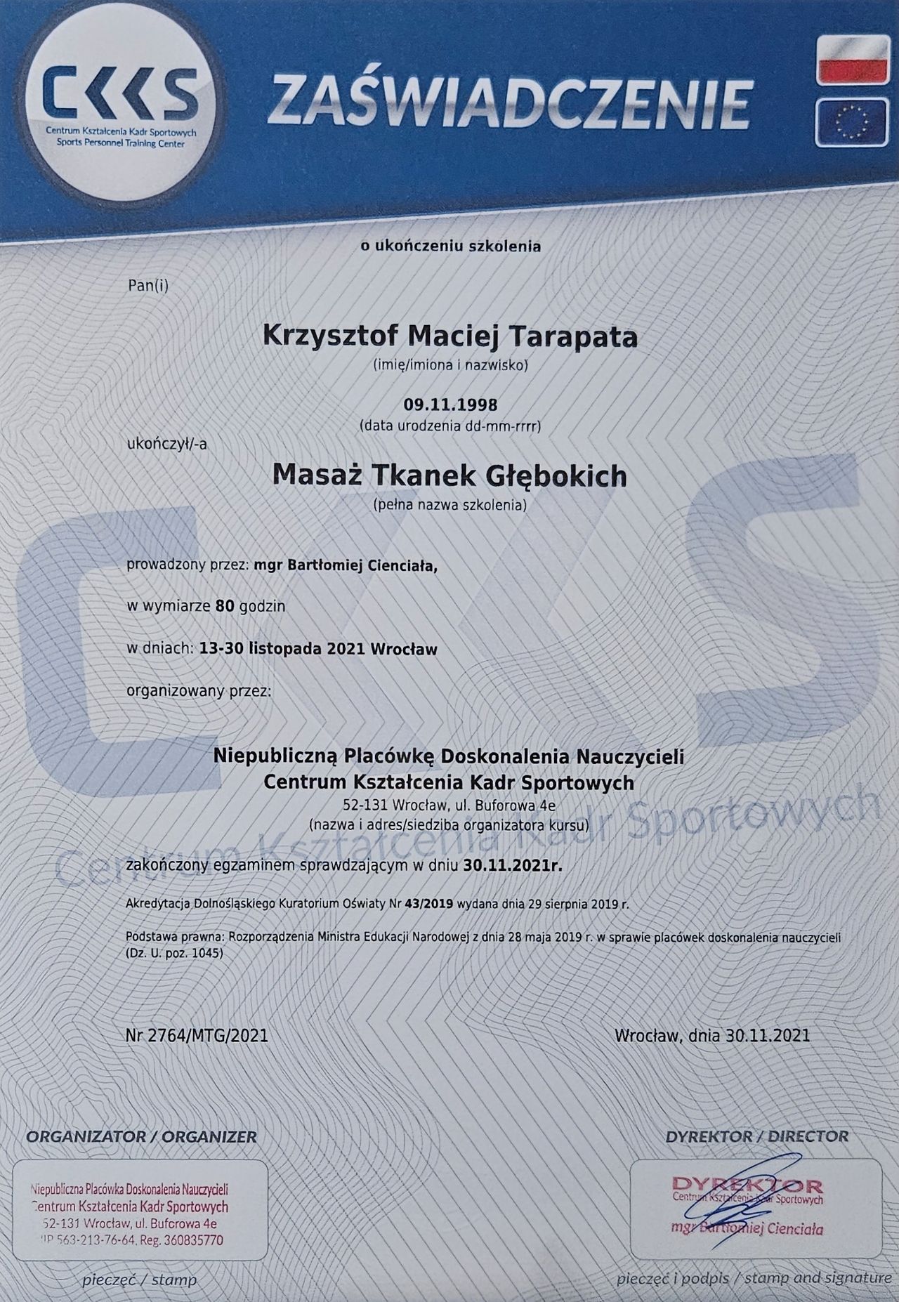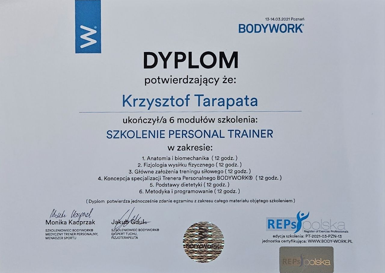 Ukończone szkolenia na trenera personalnego z akredytacją EREPS oraz instruktora trójboju siłowego pozwalają mi indywidualizować programy treningowe. Praktyczne doświadczenie treningowe i trenerskie, w połączeniu z odpowiednią wiedzą, umożliwia mi prowadzenie rehabilitacji po urazach ortopedycznych, przygotowań przedoperacyjnych, zapobiegania kontuzjom oraz optymalizacji wyników sportowych.