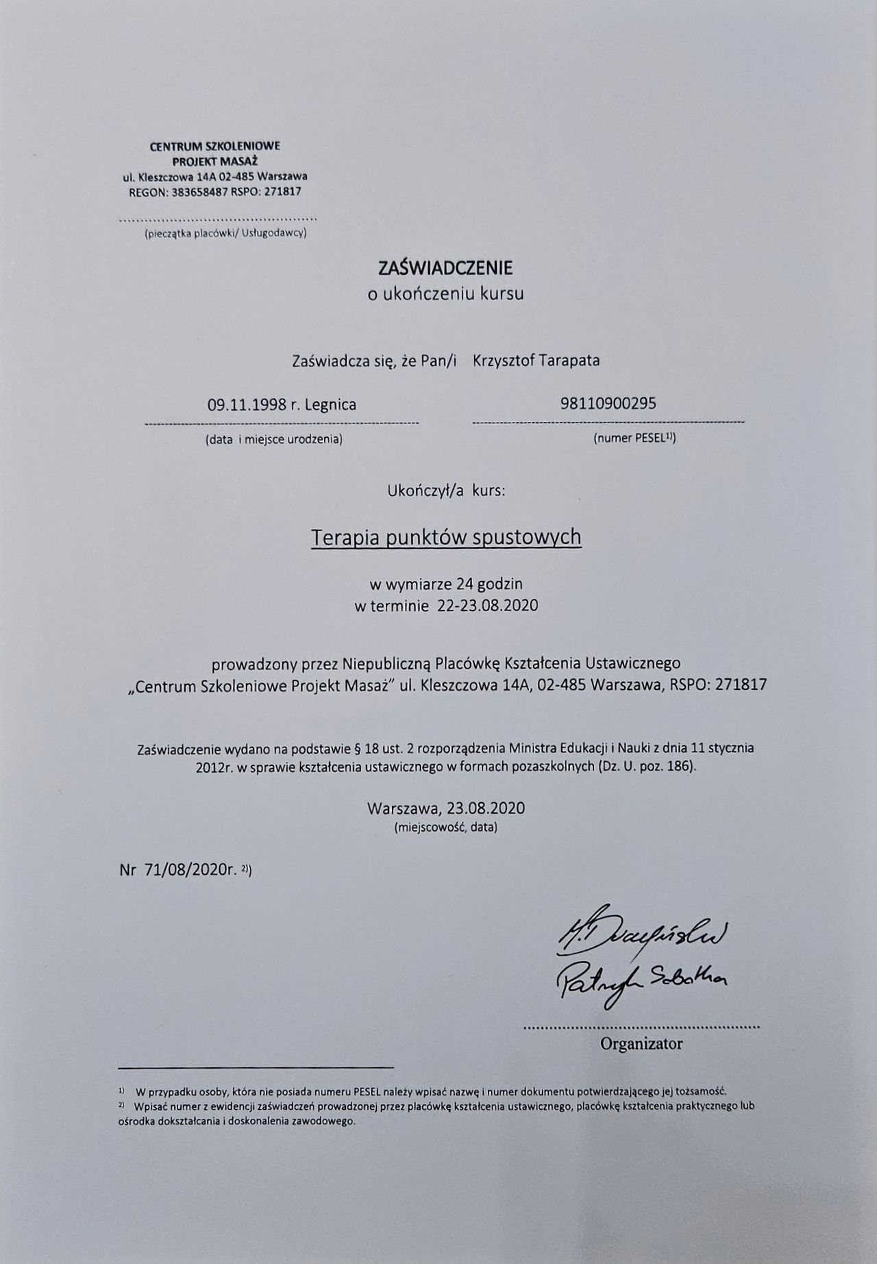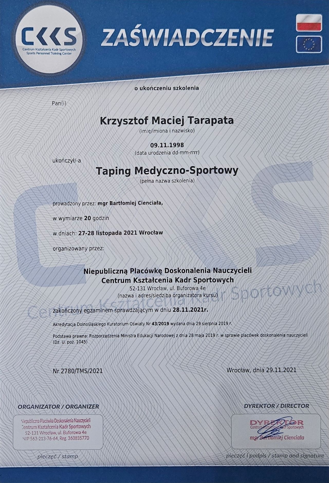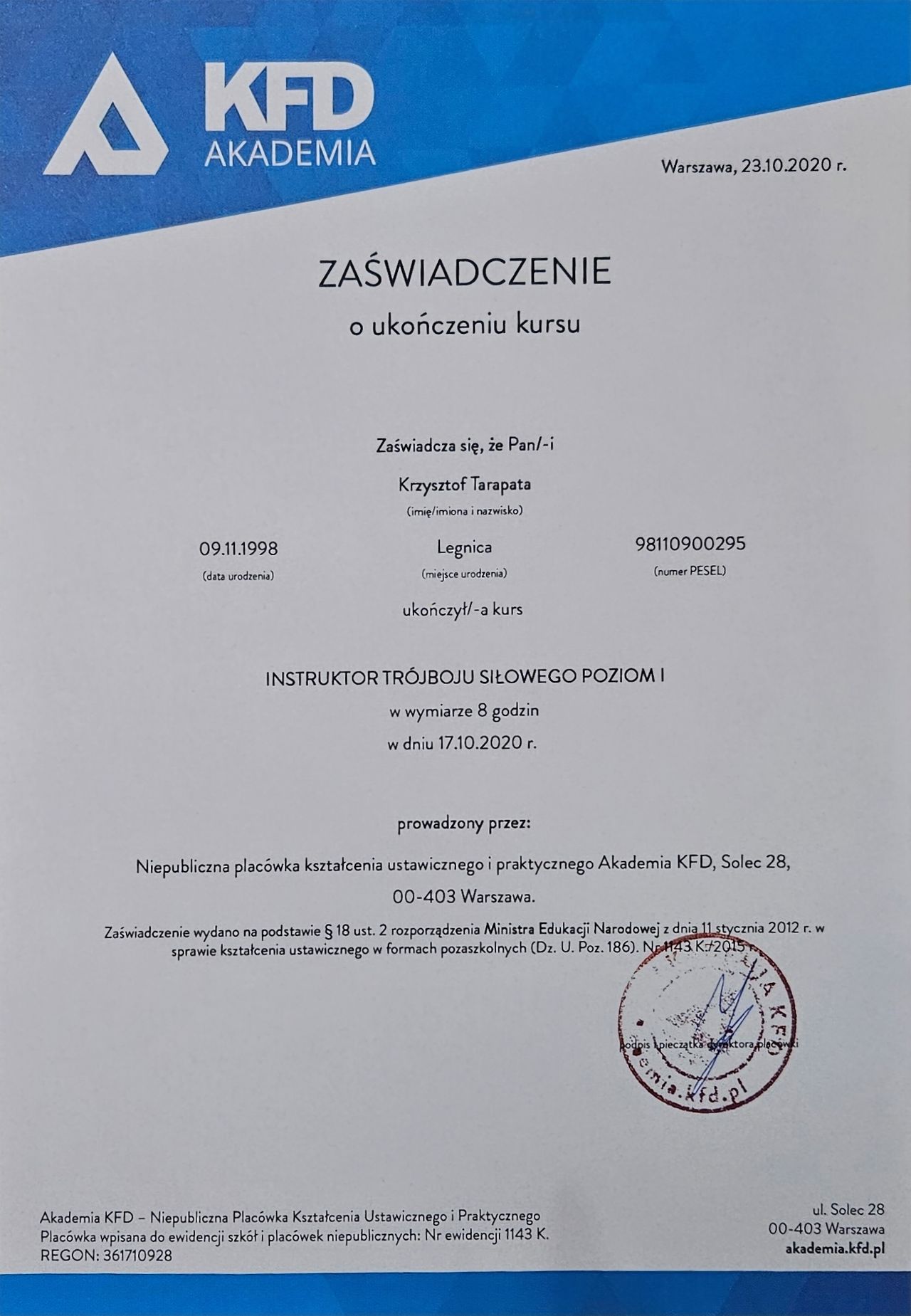 Ukończone szkolenia na trenera personalnego z akredytacją EREPS oraz instruktora trójboju siłowego pozwalają mi indywidualizować programy treningowe. Praktyczne doświadczenie treningowe i trenerskie, w połączeniu z odpowiednią wiedzą, umożliwia mi prowadzenie rehabilitacji po urazach ortopedycznych, przygotowań przedoperacyjnych, zapobiegania kontuzjom oraz optymalizacji wyników sportowych.