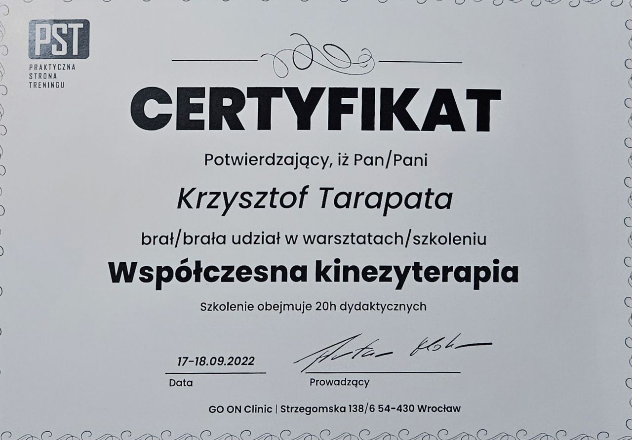 Krzysiek to super specjalista, po kilku pytaniach i testach wiedział dokładnie gdzie leży problem. Skutecznie nad nim pracujemy, dolegliwości praktycznie już minęły. Atmosfera jest bardzo przyjazna, Krzysiek to super człowiek, sama terapia jak to terapia bywa bolesna, ale jest złagodzona spora dawką śmiechu. Polecam, Krzysiek zna się na rzeczy, ma dużą wiedzę.