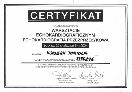 Jaki jest zakres porad oferowanych przez Ksawery Tamioła?Ksawery Tamioła to w trakcie specjalizacji (kardiolog). Na podstawie swojego doświadczenia i wykształcenia Ksawery Tamioła oferuje usługi takie jak: konsultacja kardiologiczna, Konsultacja kardiologiczna + UKG (pierwsza wizyta), konsultacja kardiologiczna/hipertensjologiczna.