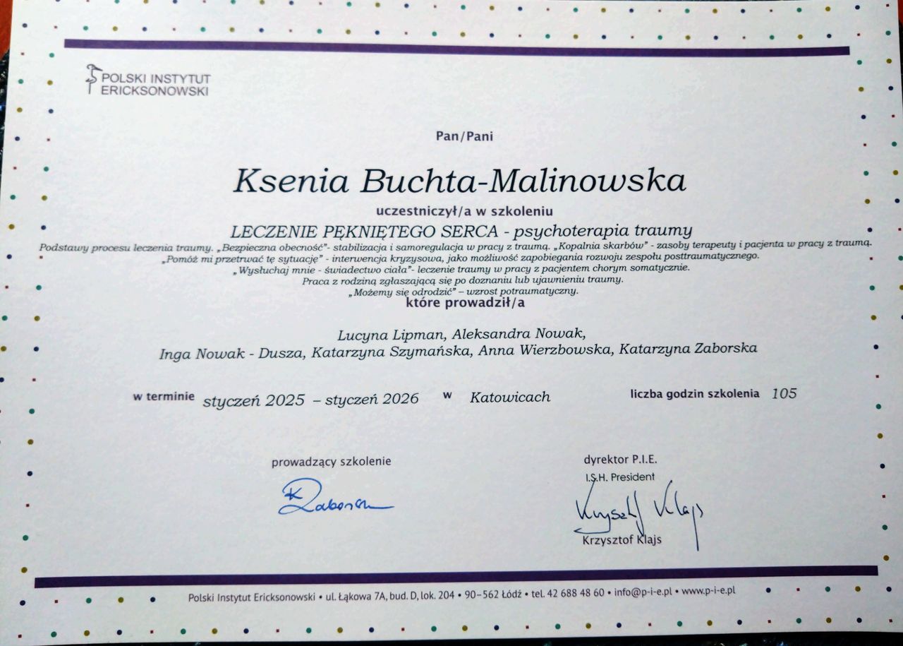 Na początku 2019 roku ukończyłam, trwający 4,5 roku, Podyplomowy Kurs Psychoterapii w Polskim Instytucie Ericksonowskim. Regularnie biorę również udział w różnego rodzaju szkoleniach oraz konferencjach naukowych, systematycznie podnosząc moje kompetencje zawodowe.
