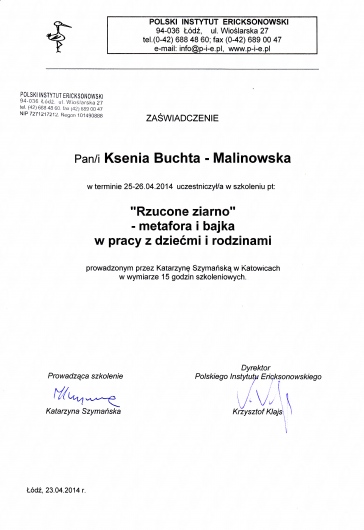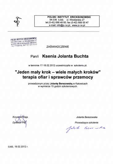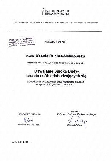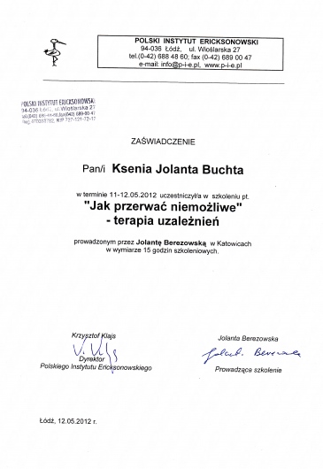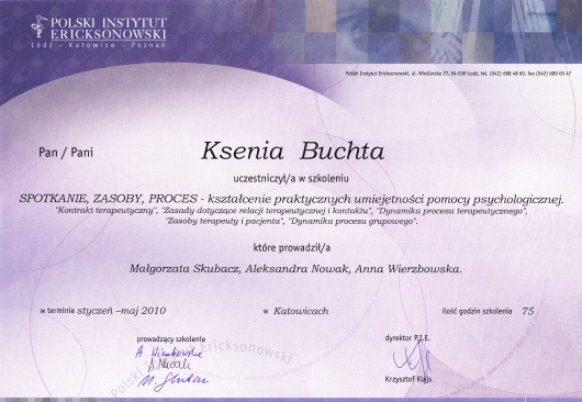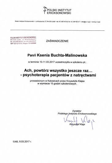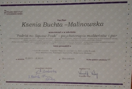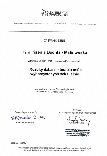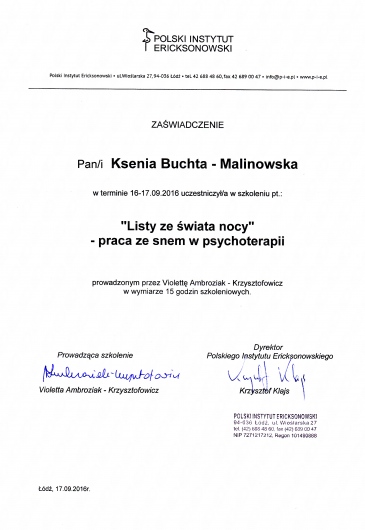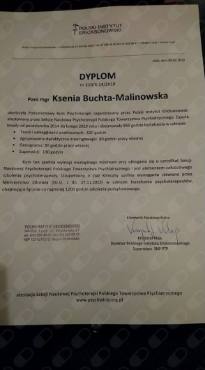 Jestem absolwentką psychologii Uniwersytetu Śląskiego w Katowicach. Kształciłam się także w Studium Psychoterapii Uzależnień w Krakowie, uzyskując w 2014 roku certyfikat specjalisty psychoterapii uzależnień (nr PARPA 1375). Dodatkowo zdobyłam uprawnienia realizatora programu Candis (terapia osób uzależnionych od marihuany). Na początku 2019 roku ukończyłam Podyplomowy Kurs Psychoterapii w Polskim Instytucie Ericksonowskim, przygotowujący do uzyskania certyfikatu psychoterapeuty. Regularnie biorę również udział w szkoleniach i konferencjach naukowych, podnoszących moje kompetencje zawodowe.