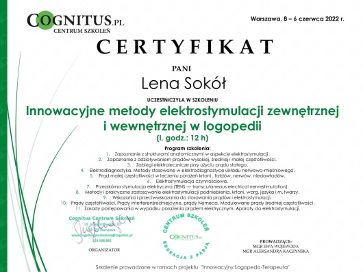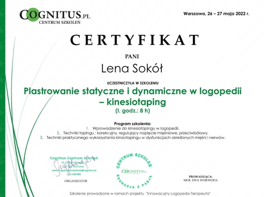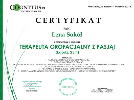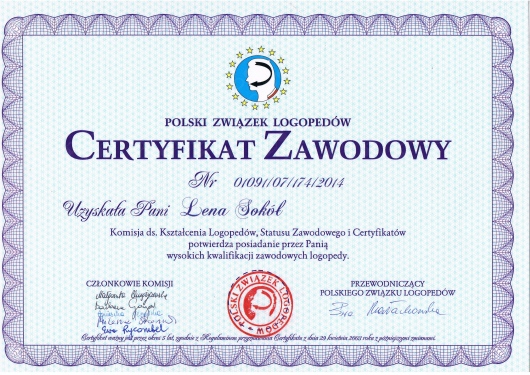 Jestem dyplomowanym logopedą / neurologopedą z 19-letnim doświadczeniem. Ukończyłam jednolite, pięcioletnie studia logopedyczne i dwuletnią specjalizację z neurologopedii. Jestem również certyfikowanym terapeutą jąkania, terapeutą orofacjalnym (miofunkcjonalnym), pedagogiem specjalnym i terapeutą ręki (I i II stopień). (Certyfikat Zawodowy Logopedy nr 01091/07/0174/2014 przyznawany przez Polski Związek Logopedów) Pracuję z dorosłymi pacjentami ortodontycznymi. Specjalizuję się również w diagnozie i terapii dzieci, korygującej wady wymowy, wyrównującej jej opóźnienia, poprawiającej płynność i wyrazistość mówienia. Pracuję z dziećmi z ORM, afazją, alalią, mutyzmem, seplenieniem, rotacyzmem, lambdacyzmem, kappacyzmem, mową bezdźwięczną, dysleksją i dysgrafią. Współpracuję z warszawskimi placówkami oświatowymi i terapeutycznymi. W pracy staram się korzystać z różnych metod i technik terapeutycznych, mających ścisły związek z rozwojem i jakością wymowy (m.in. terapia miofunkcjonalna, elektrostymulacja, kinesiotaping, masaż logopedyczny). Jestem również absolwentką Państwowej Szkoły Muzycznej w dziale fortepianu, co bardzo pomaga mi w pracy nad aktywizowaniem sfery słuchowo-ruchowej dzieci, w ścisłym połączeniu z metodologią pracy logopedycznej. Stale podnoszę swoje kwalifikacje uczestnicząc w wielu szkoleniach- m.in.: ,,Akademia terapeuty miofunkcjonalnego" ,,Diagnoza i terapia rynolalii" ,,Terapia orofacjalna" , ,,Plastrowanie statyczne i dynamiczne w logopedii- kinesiotaping" ,,Ankyloglosja- krótkie wędzidełko języka, diagnoza i terapia przed i po zabiegu", ,,Artykulacja- ocena mowy dzieci. Korekcja i sposoby wywoływania głosek. Diagnoza i terapia logopedyczna" ,,Diagnoza funkcjonalna dzieci z uszkodzeniami słuchu", ,,Audiologia dla logopedy", ,,Integracja sensoryczna w logopedii" ,,SI w terapii logopedycznej dziecka z ASD" ,,Frenotomia'', ,,Wszystko o wędzidełku- okiem praktyka" ,,Emisja głosu...", ,,Reedukacja oddechowa w terapii dzieci" ,,Oddychanie a ORM- wpływ sposobu oddychania na rozwój mowy" ,,Diagnoza opóźnionego rozwoju mowy"" ,,Specyficzne zaburzenia językowe (SLI)" ,,Wibratory logopedyczne w praktyce-wskazówki do masażu logopedycznego" ,,Masaż logopedyczny sfery orofacjalnej" ,,Afazja-terapia dzieci z zaburzeniami mowy" ,,Mutyzm wybiórczy u dzieci w wieku przedszkolnym" ,,Seplenienie boczne", ,,Dyslalia..." ,,Rozwój komunikacji u osób z ASD", ,,AAC-fakty i mity", ,,Dziecko ze spektrum autyzmu..." ,,Jak pracować z dziećmi z ASD- dwutorowe wsparcie" ,,Makaton- program rozwoju komunikacji" ,,Jąkanie-od teorii do praktyki", ,,Nauka czytania od sylaby do zdania", ,,Trudności w jedzeniu u małych dzieci...", ,,Terapia karmienia" ,,Wczesne wspomaganie rozwoju dziecka" i wiele innych. Jeżeli zależy Państwu, by terapia logopedyczna była dla Waszego dziecka przede wszystkim przyjemnością, a nie tylko koniecznością, zapraszam.