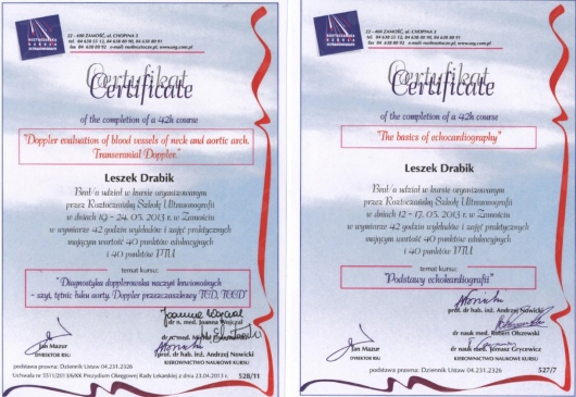 • Certyfikat ultrasonografii dopplerowskiej naczyń szyjnych i kręgowych Polskiego Towarzystwa Ultrasonograficznego DTS 998/2015.