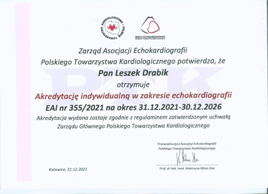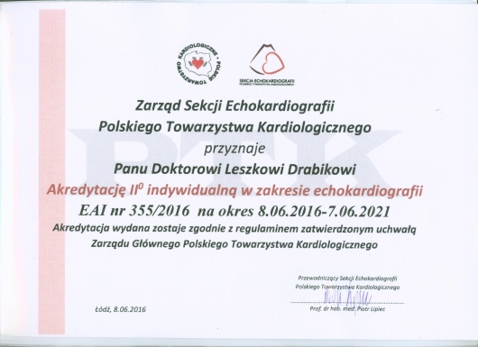 • Akredytacja II stopnia indywidualna w zakresie echokardiografii Polskiego Towarzystwa Kardiologicznego EAI nr 355/2016 oraz EAI nr 355/2021