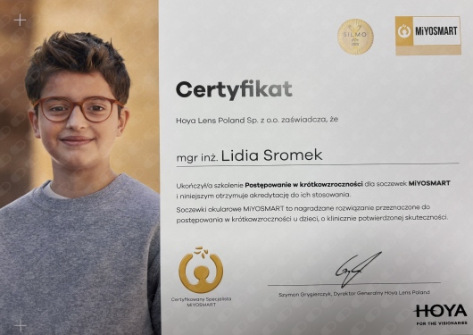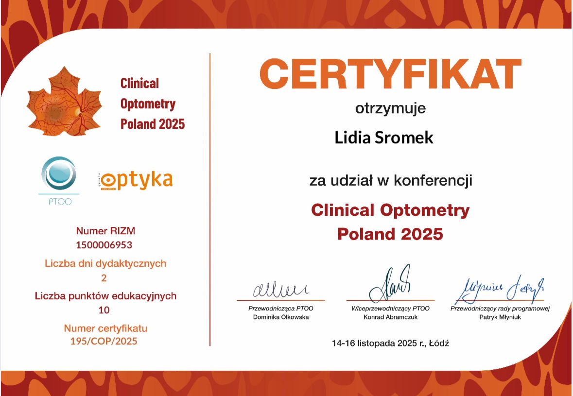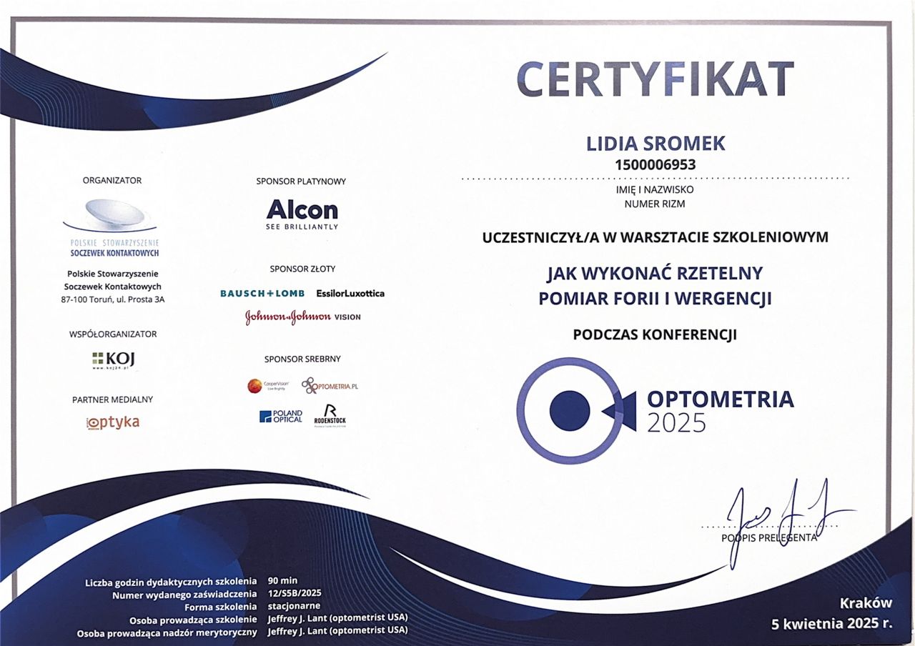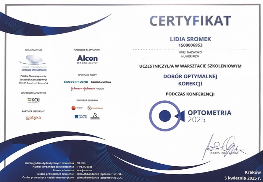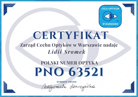 Jestem dyplomowanym optometrystą, absolwentką studiów podyplomowych z zakresu optometrii w Wyższej Szkole Nauk o Zdrowiu (RIZM 1500006953) oraz członkinią Polskiego Towarzystwa Optometrii i Optyki (PTOO). Posiadam również kwalifikacje i wieloletnie doświadczenie w pracy jako optyk okularowy (PNO 63521), co pozwala mi kompleksowo odpowiadać na potrzeby pacjentów w zakresie diagnostyki i korekcji wzroku.