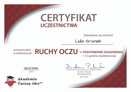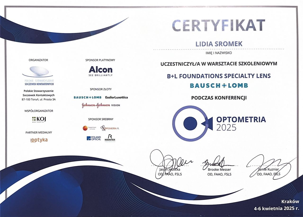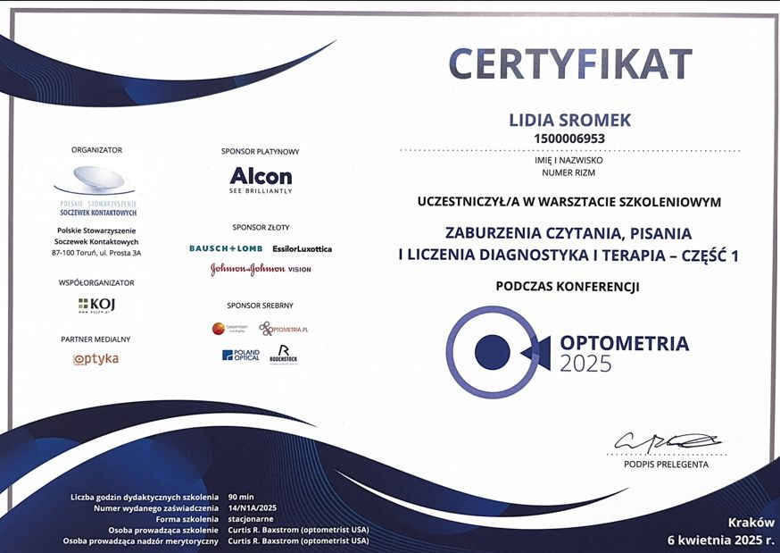 Nieustannie podnoszę swoje kwalifikacje, uczestnicząc w szkoleniach, konferencjach i warsztatach, aby pracować zgodnie z najnowszymi standardami optometrii. Korzystam z nowoczesnych narzędzi diagnostycznych i sprawdzonych metod terapeutycznych, by zapewniać skuteczne i indywidualnie dopasowane rozwiązania.