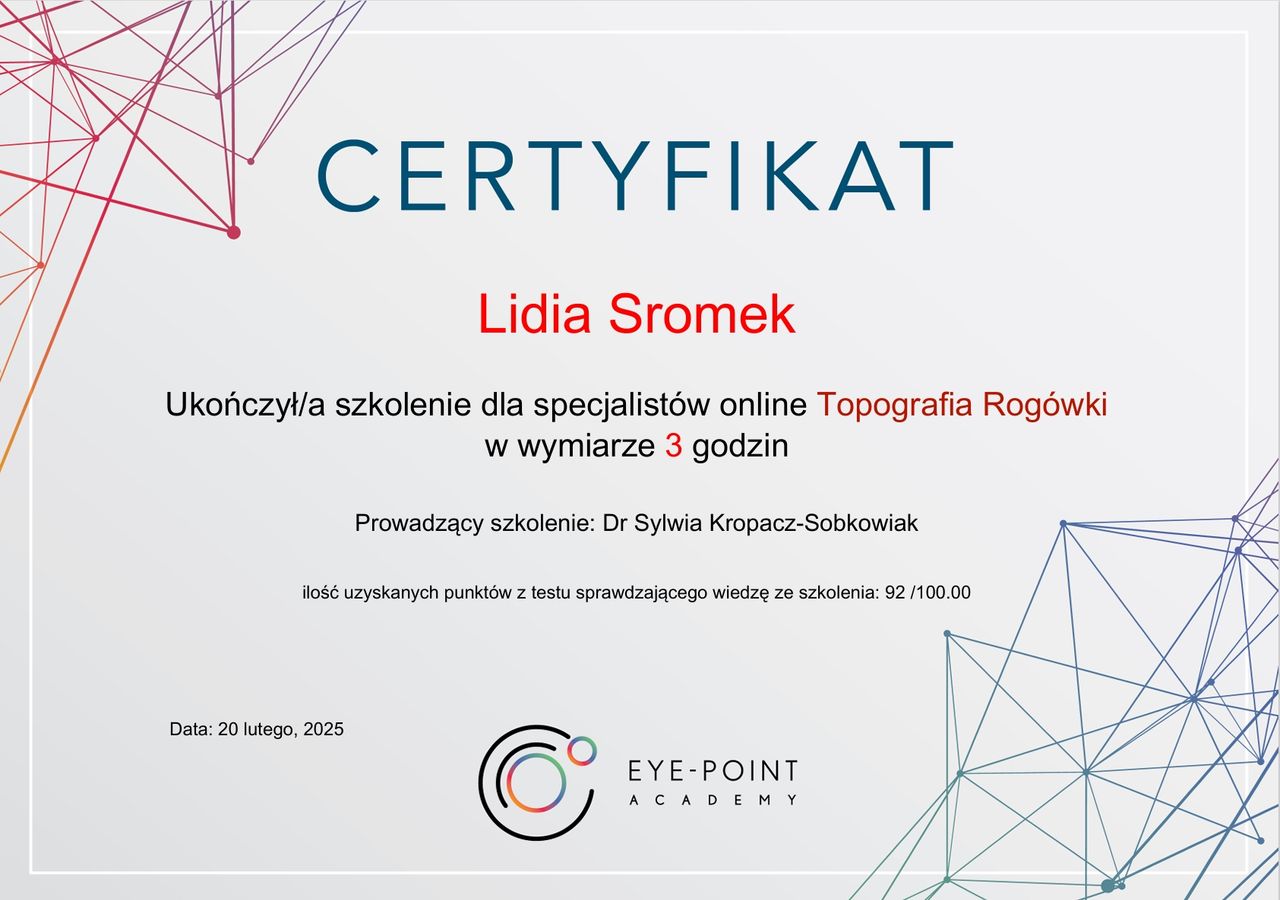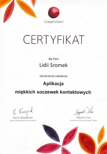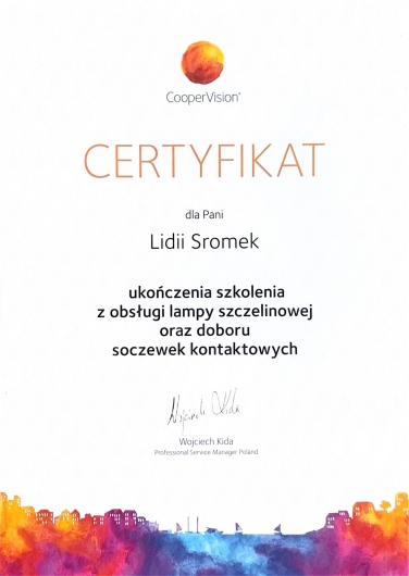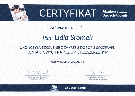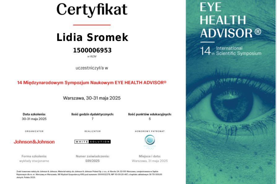 Jaki jest zakres porad oferowanych przez Lidia Sromek?Lidia Sromek to optometrysta. Na podstawie swojego doświadczenia i wykształcenia Lidia Sromek oferuje usługi takie jak: Konsultacja optometryczna, dobór soczewek kontaktowych miękkich, Badanie na synoptoforze, pole widzenia, pole widzenia obu oczu (również neurologiczne), Diagnostyka suchego oka z obrazowaniem gruczołów Meiboma, diagnostyka Zespołu Suchego Oka, soczewki hybrydowe, soczewki miniskleralne, Terapia suchego oka Intensed Pulsed Light.