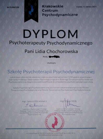 Ukończyłam czteroletnie szkolenie w Krakowskim Centrum Psychodynamicznym. Swoją pracę poddaje stałej superwizji.