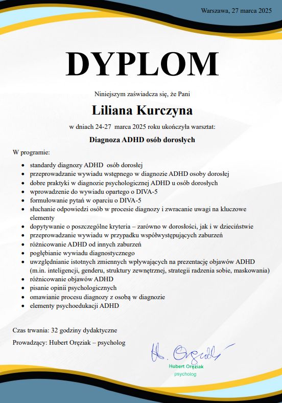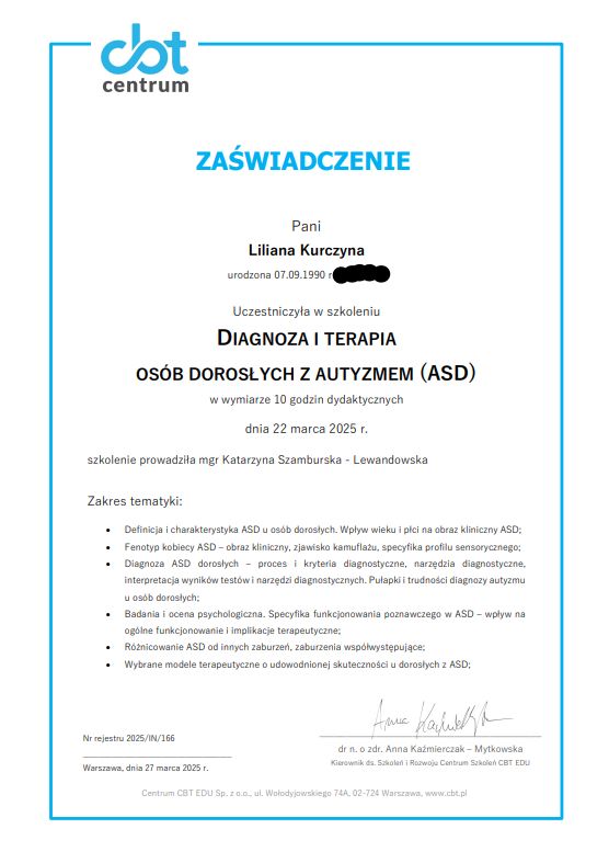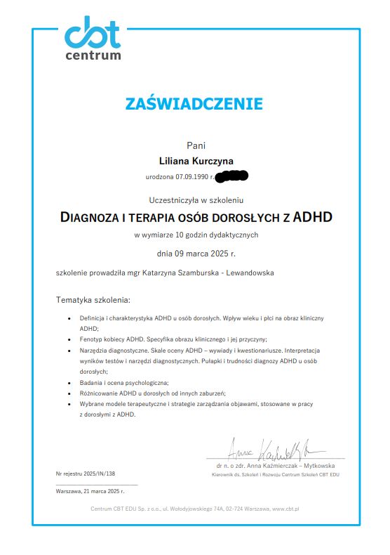 Nazywam się Liliana Kurczyna, urodziłam się w 1990 r. Jestem psychologiem oraz psychoterapeutką poznawczo - behawioralną / CBT w trakcie certyfikacji. W mojej pracy zawodowej skupiam się na różnorakiej formie pomocy dla dorosłych osób neuroatypowych (ADHD oraz spektrum autyzmu), sam proces diagnozy tych jednostek jest u mnie również dostępny i przeprowadzany jest z pełną dokładnością. Wspieram także osoby zmagające się z wszelkimi innymi trudnościami emocjonalnymi. Przykładam dużą wagę do budowania relacji z klientami, dokładam wszelkich starań by każdy z nich uzyskał odpowiednią pomoc. Celem mojej pracy jest możliwie największy wzrost poczucia satysfakcji z życia u zgłaszających się do mnie osób.