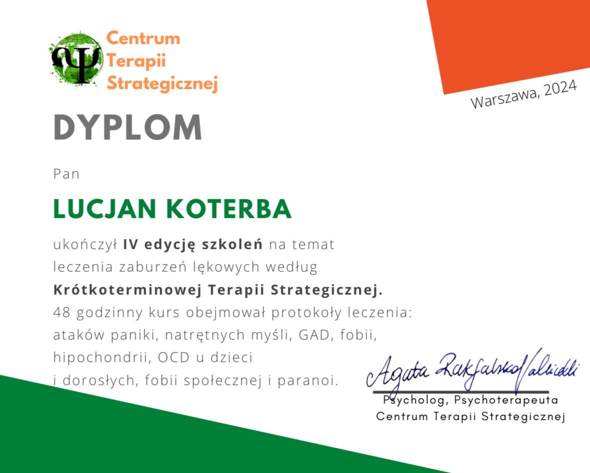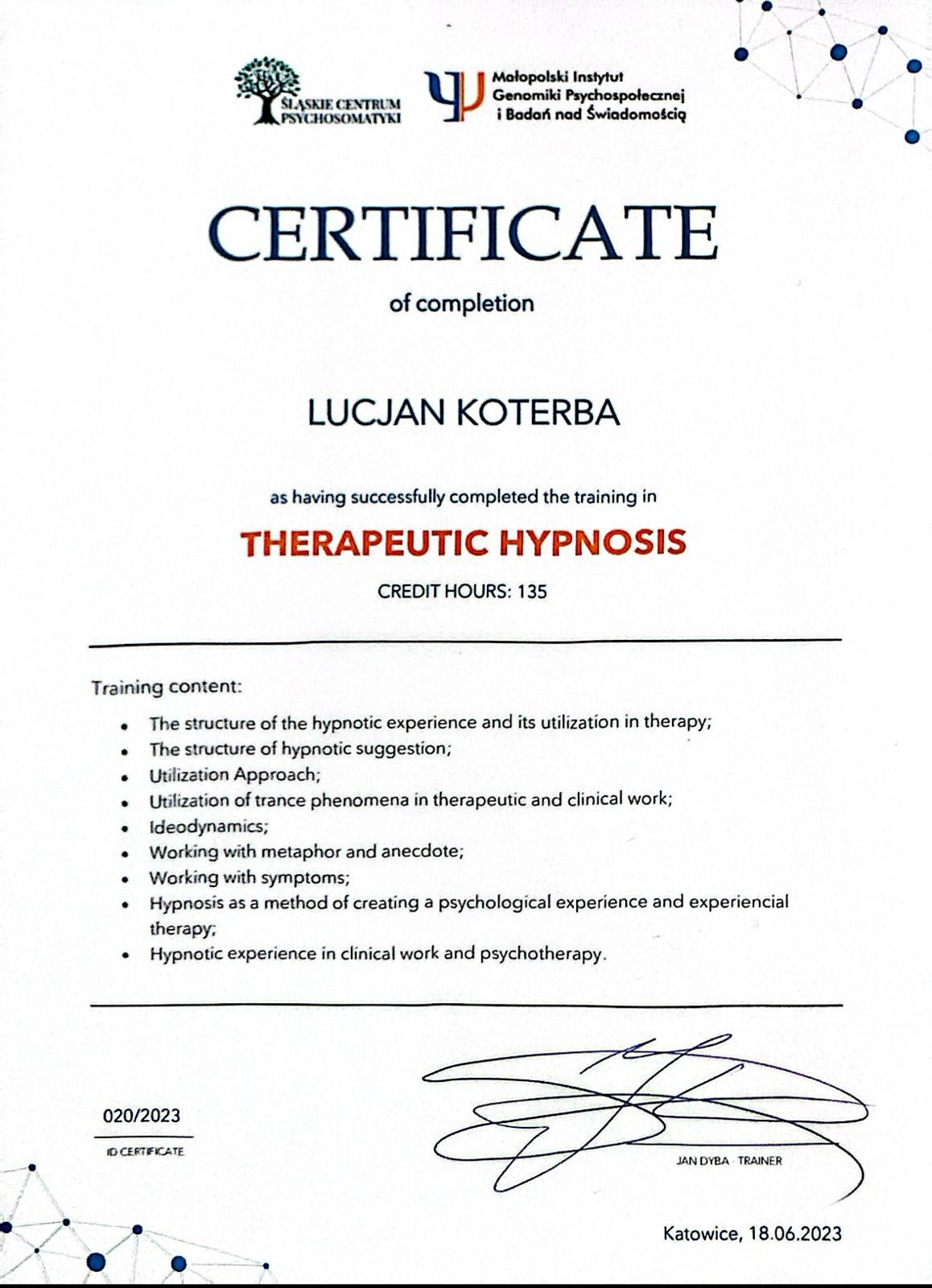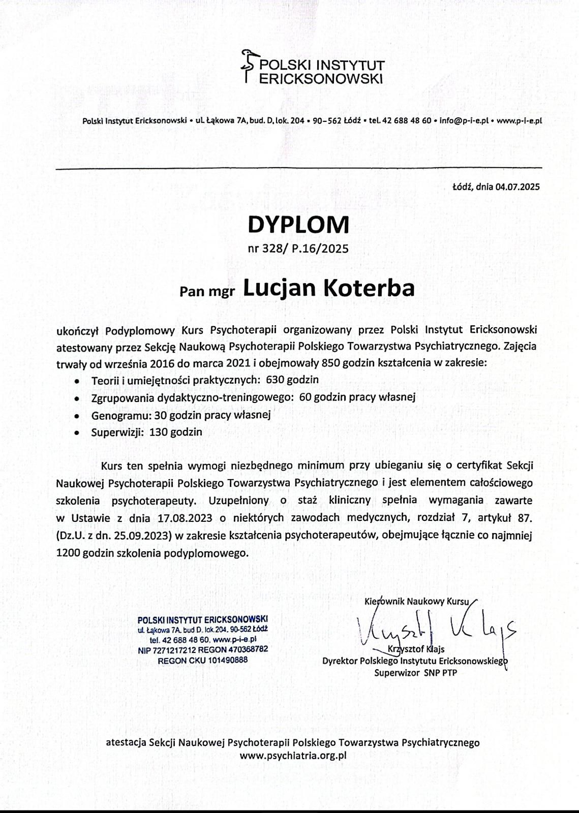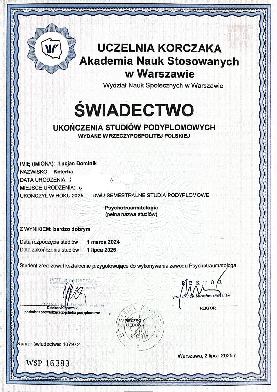 Jestem magistrem psychologii, dyplomowanym psychotraumatologiem oraz psychoterapeutą. Ukończyłem 4,5-letnie szkolenie psychoterapeutyczne w podejściu ericksonowskim (ponad 1200 godzin intensywnych szkoleń), które stanowi solidną bazę mojej pracy klinicznej. Pracuję również w nurcie Terapii Skoncentrowanej na Rozwiązaniach, stosując podejście strategiczne, hipnozę kliniczną oraz metodę Brainspotting oraz EMDR w terapii indywidualnej.