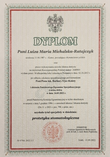 Dziękuję Pani doktor Luiza Michalska-Ratajczyk za kompleksowe leczenie: przywrócenie mi "pięknego uśmiechu", uzupełnienie brakującego uzębienia i wyleczenie zębów tego wymagających, zlikwidowanie barier mających negatywny wpływ na stawy skroniowo-żuchwowe i prawidłowy zgryz oraz zminimalizowanie bruksizmu, jak również zalecenie w ramach rehabilitacji - terapii manualnej, mięśniowo-powięziowej, znoszącej napięcia nerwów w punktach spustowych a w konsekwencji dolegliwości bólowe.