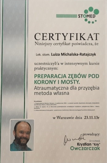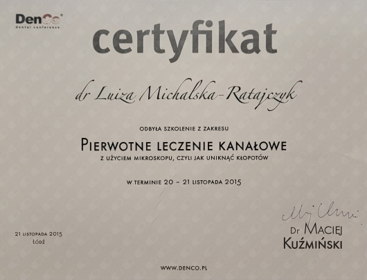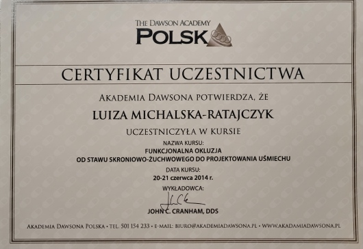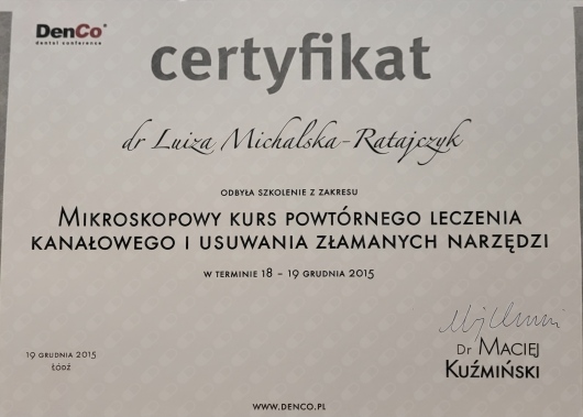 Absolwentka licznych kursów o tematyce endodoncji, protetyki, okluzji i planowania kompleksowego leczenia. m.in.: