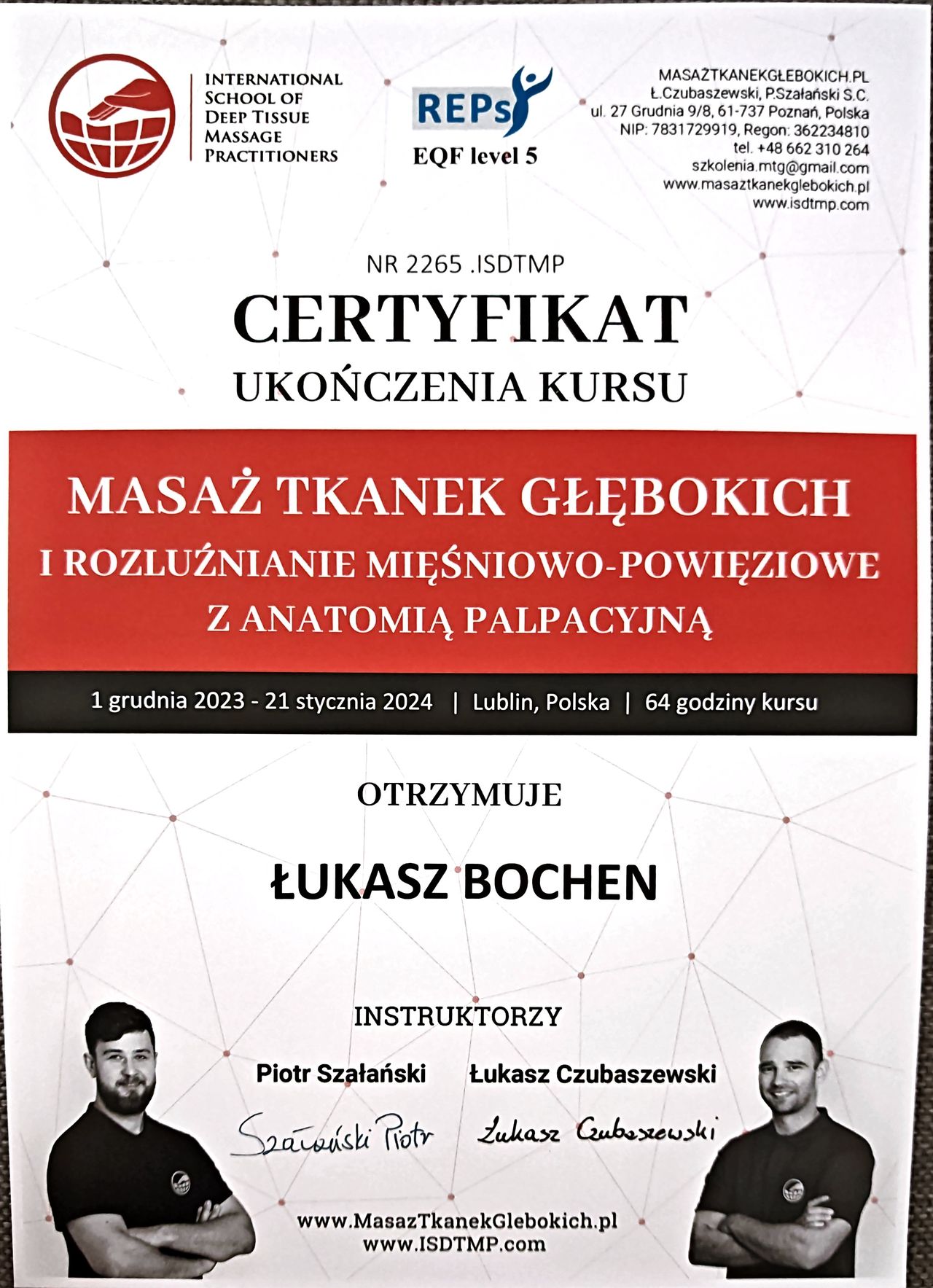 Jaki jest zakres porad oferowanych przez Łukasz Bochen?Łukasz Bochen to fizjoterapeuta. Na podstawie swojego doświadczenia i wykształcenia Łukasz Bochen oferuje usługi takie jak: Fala uderzeniowa, terapia manualna + fala uderzeniowa, Konsultacja fizjoterapeutyczna ( I wizyta, diagnoza + terapia ), konsultacja fizjoterapeutyczna, Masaż leczniczy, masaż leczniczy 90 minut, masaż relaksacyjny, masaż (dłuższa wizyta), masaż sportowy, terapia manualna + suche igłowanie.