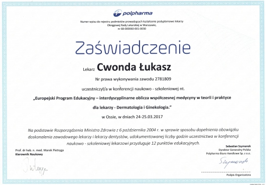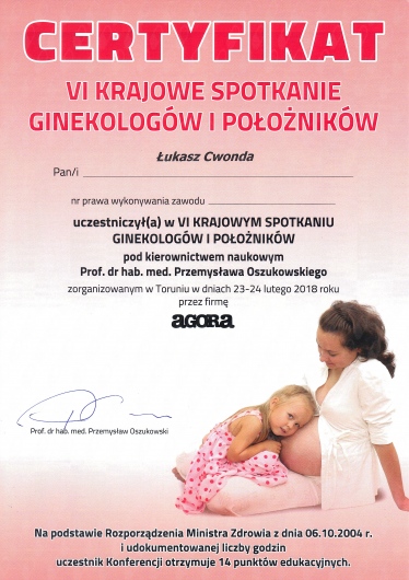 Jestem absolwentem Uniwersytetu Medycznego w Łodzi. Specjalizuję się w ginekologii i położnictwie. Na co dzień pracuje w Oddziale Ginekologiczno-Położniczym WSS im. M. Skłodowskiej Curie w Zgierzu. W ramach specjalizacji przeprowadzam konsultacje ginekologiczne, prowadzę ciąże, odbieram porody oraz wykonuję cięcia cesarskie. Zajmuję się również diagnostyką ultrasonograficzną w położnictwie i ginekologii. Naukowo realizuję się w tematyce ginekologii onkologicznej. Uczestniczę w wielu sympozjach i kongresach naukowych, starając się stale pogłębiać swoją wiedzę.