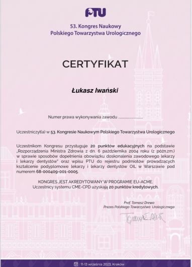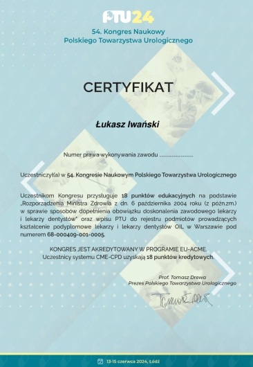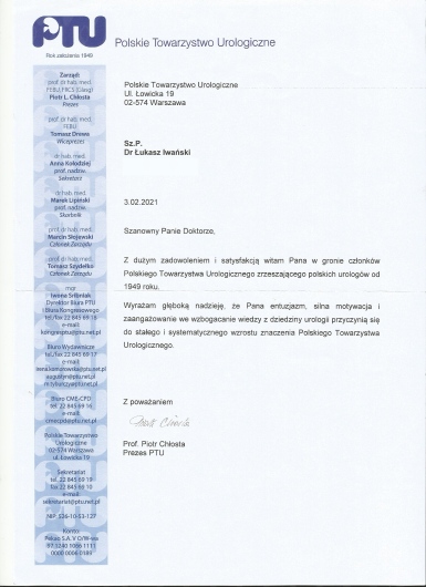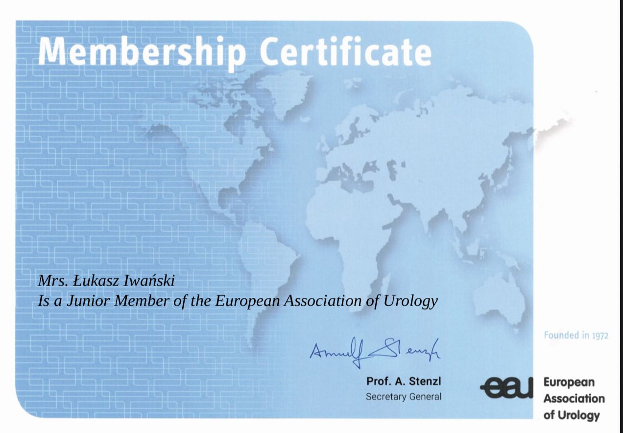 Należę do Polskiego Towarzystwa Urologicznego sekcji Adeptów Urologii (PTU) oraz Europejskiego Towarzystwa Urologicznego (ESRU).