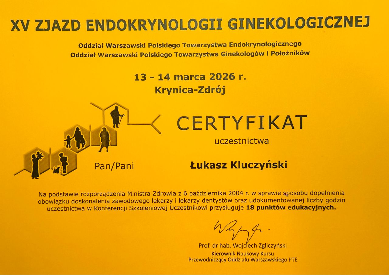 Jestem absolwentem Wydziału Lekarskiego Collegium Medicum Uniwersytetu Jagiellońskiego w Krakowie. W trakcie studiów uczestniczyłem w wymianie studenckiej w ramach programu Erasmus w Universiteit Antwerpen w Belgii; ponadto odbyłem praktyki w Crimea State Medical University na Ukrainie. Pozwoliło mi to poszerzyć moje horyzonty oraz zapoznać się z metodami leczenia w ośrodkach zagranicznych. Szkolenie specjalizacyjne realizowałem w Oddziale Klinicznym Endokrynologii Szpitala Uniwersyteckiego w Krakowie, gdzie pracę zawodową łączyłem z prowadzeniem zajęć dydaktycznych dla studentów medycyny, dietetyki i analityki medycznej. W XI 2020 r. uzyskałem tytuł specjalisty w dziedzinie endokrynologii, a w XI 2023 r. - doktora nauk medycznych - na podstawie pracy o rzadkich postaciach niedoczynności przysadki. Aktualnie pracuję w Zakładzie Medycyny Nuklearnej i Endokrynologii Onkologicznej Narodowego Instytutu Onkologii w Gliwicach. Odbyłem wiele kursów i szkoleń m.in. Kurs doskonalący "Choroby przysadki" Kurs doskonalący "Podstawy patofizjologii chorób układu endokrynnego" Szkolenie specjalistyczne z zakresu USG szyi i tarczycy Kurs Kształcenia Ustawicznego z Endokrynologii, Diabetologii i Chorób Metabolicznych - cyklicznie Kurs "USG tarczycy, przytarczyc, węzłów chłonnych szyi z uwzględnieniem elastografii" Kurs "Endocrine Diseases in Pregnancy" Kurs zaawansowany "USG tarczycy" Kurs EuroPIT Kurs Pituitary Update Warsztaty Kliniczne "Praktyczne postępowanie w akromegalii" Szkoła Terapii Otyłości "Talia" Stale podnoszę swoje kwalifikacje poprzez uczestnictwo w konferencjach naukowych dotyczących chorób endokrynologicznych, diabetologicznych i cywilizacyjnych.