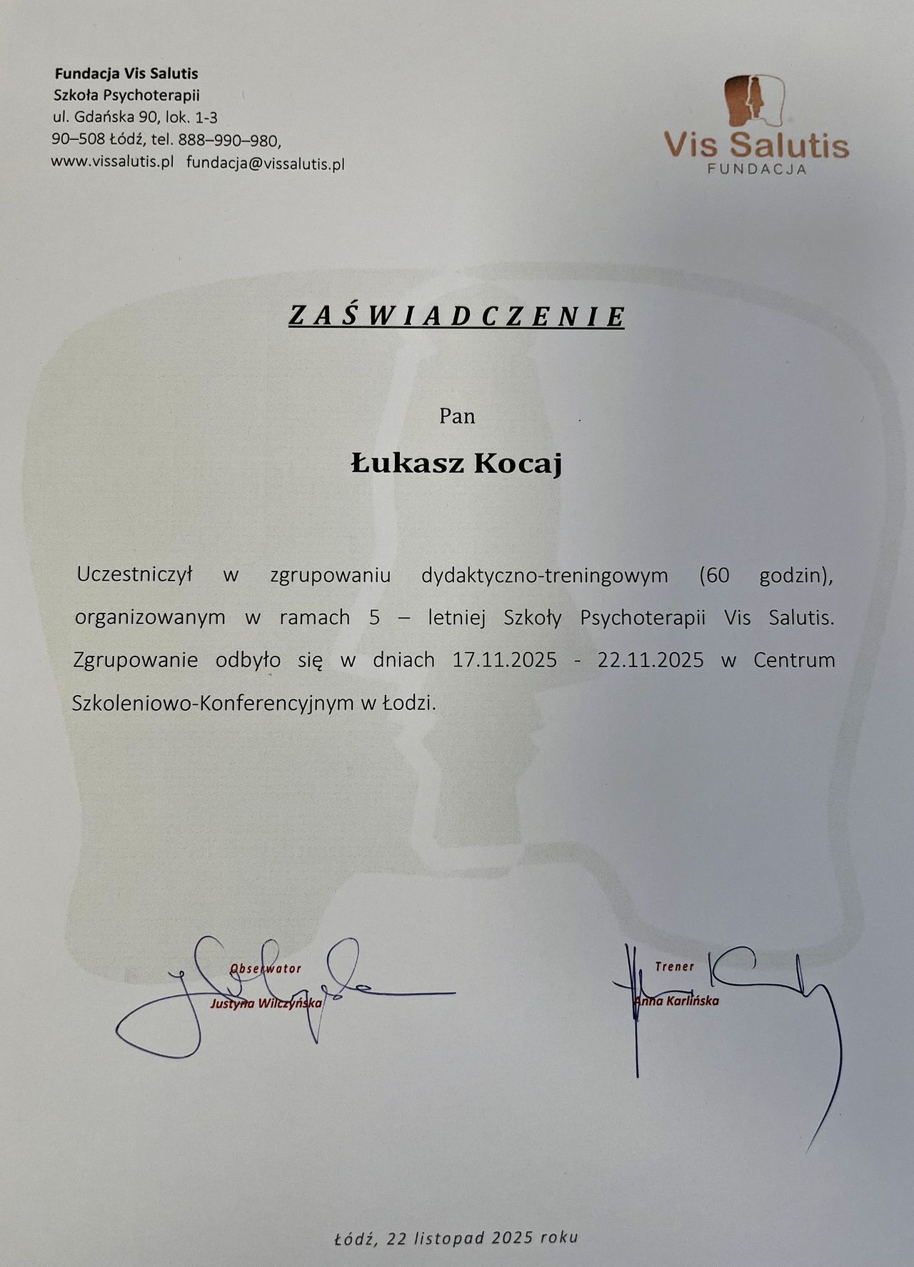 Jestem psychologiem i certyfikowanym specjalistą psychoterapii uzależnień. Obecnie kształcę się w Szkole Psychoterapii VIS Salutis w Łodzi (atest Polskiego Towarzystwa Psychiatrycznego), realizując pięcioletnie szkolenie w nurcie integracyjnym.
