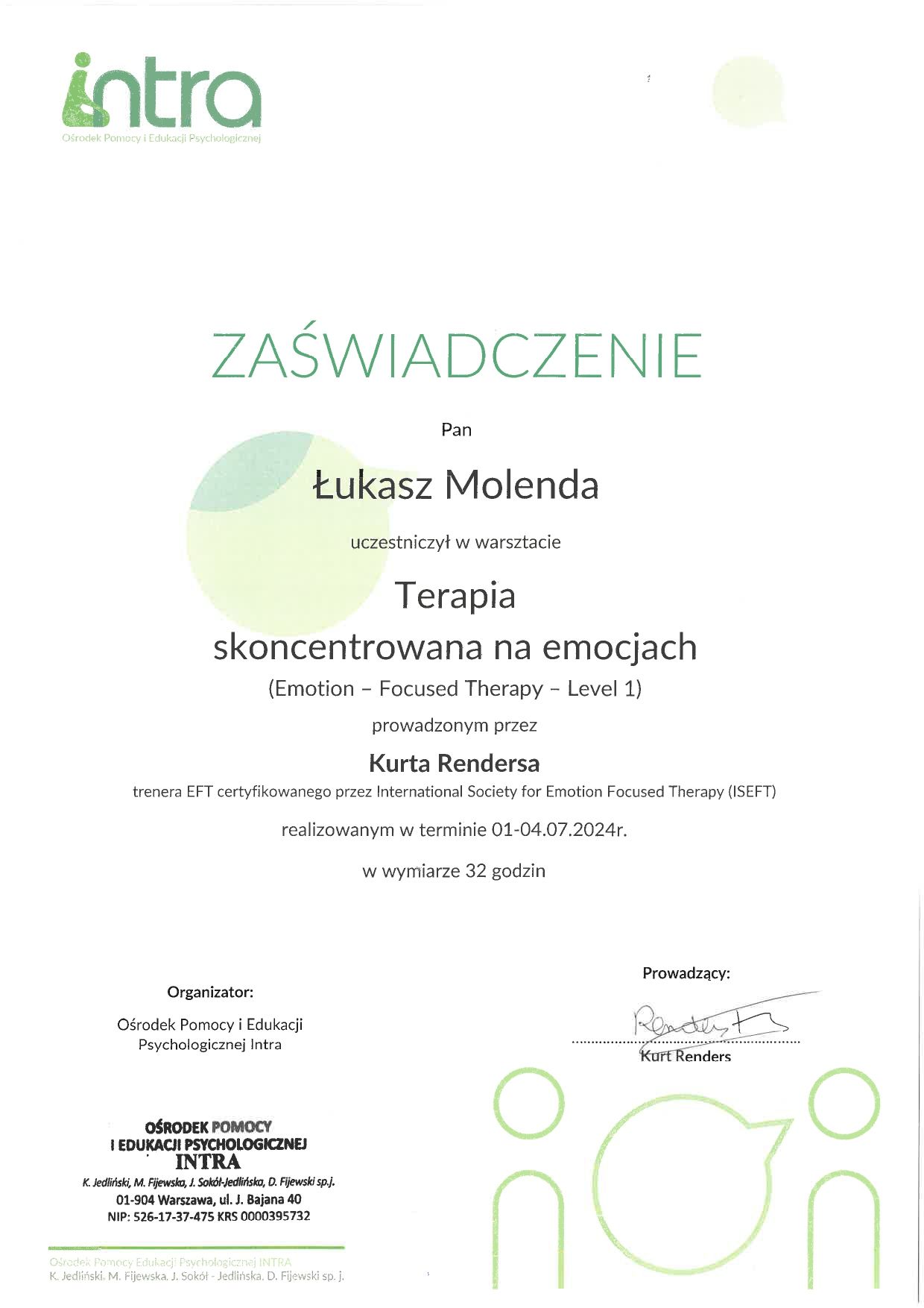 * Szkoła Psychoterapii w Ośrodku Pomocy i Edukacji Psychologicznej INTRA rekomendowana przez Polskie Towarzystwo Psychologiczne – Terapeuta w trakcie szkolenia