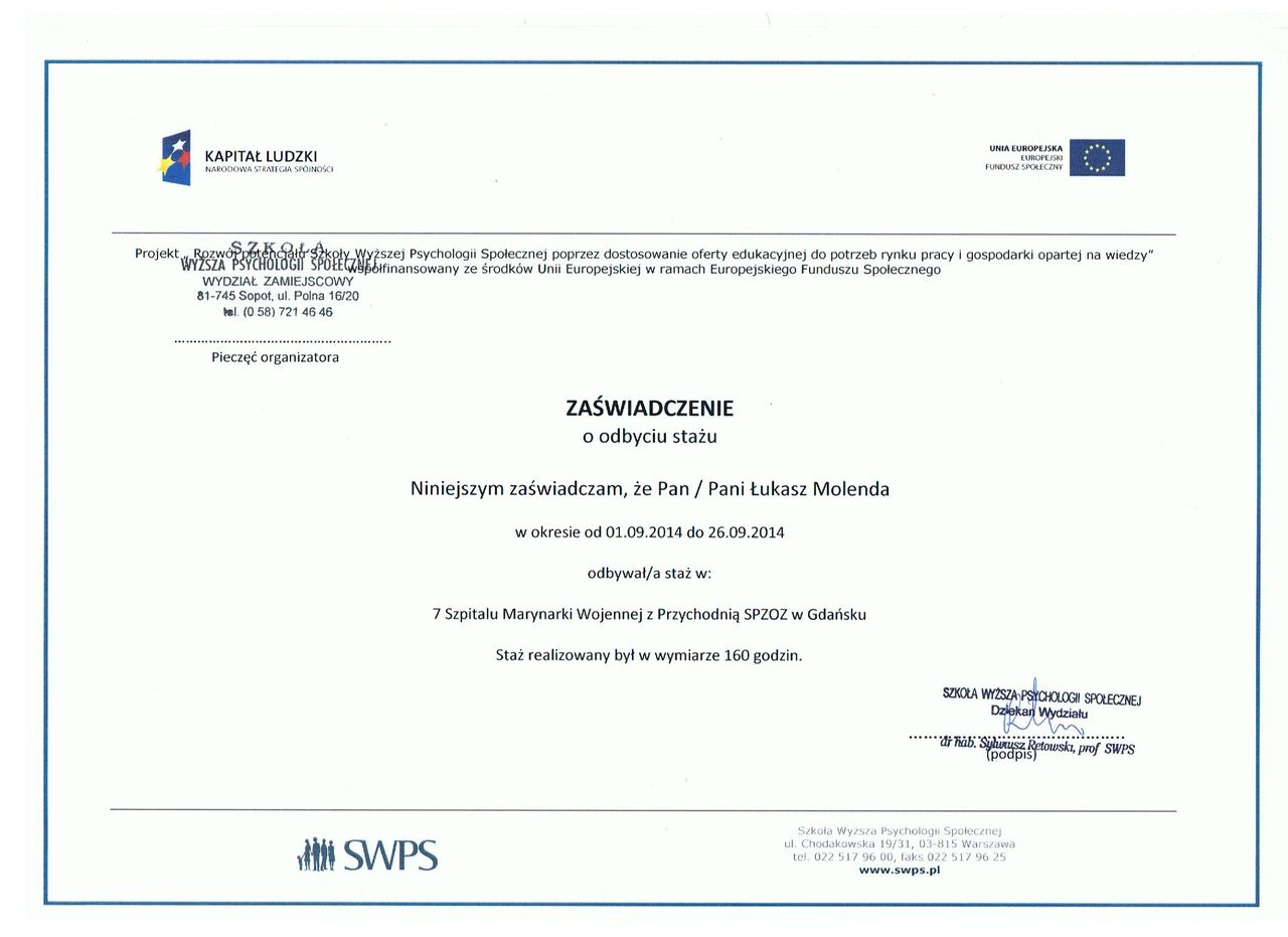 * Staż na oddziale psychiatrycznym w 7 Szpitalu Marynarki Wojennej z przychodnią SPZOZ w Gdańsku
