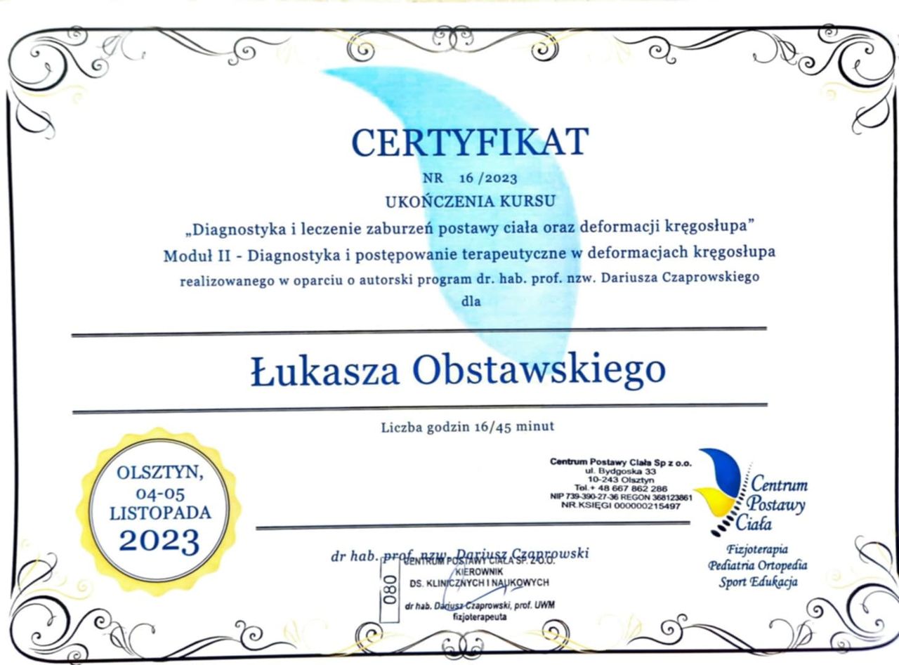 Specjalizuję się w terapii dzieci z wadami postawy i skoliozami. Doświadczenie zdobywałem w Ośrodku Ortopedyczno – Rehabilitacyjnym dla Dzieci i Młodzieży STOCER w Konstancinie.