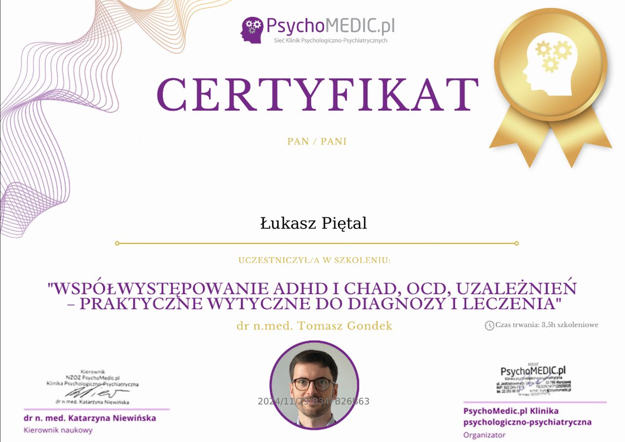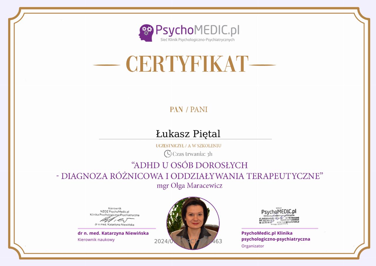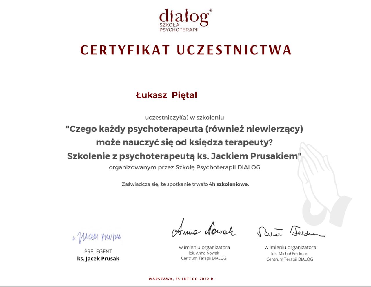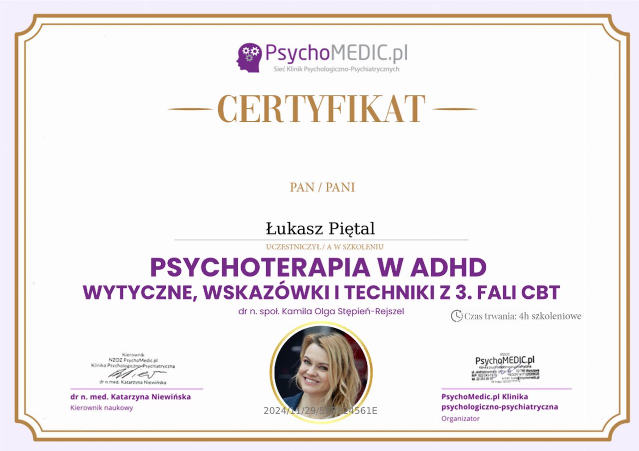 Stale poszerzam swoje kompetencje, biorąc udział w licznych certyfikowanych kursach z zakresu psychoterapii, takich jak: Diagnoza i pomoc psychologiczna osobom z depresją i obniżeniem nastroju Terapia lęku, załamania nerwowego i wyczerpania emocjonalnego Time Perspective Therapy wykorzystywana w pracy z PTSD Praca z zaburzeniami osobowości w gabinecie psychologa i psychoterapeuty Osobowość narcystyczna – wyzwania diagnostyczne i niuanse terapeutyczne Skuteczne metody terapii uzależnień na miarę XXI wieku Diagnoza i terapia zaburzeń przywiązania we współczesnej praktyce psychologicznej Wysoka wrażliwość – droga do rozumienia siebie Jak pracować z pacjentem z natręctwami religijnymi? Religia i duchowość w psychoterapii Praca z natręctwami w gabinecie psychoterapeuty.