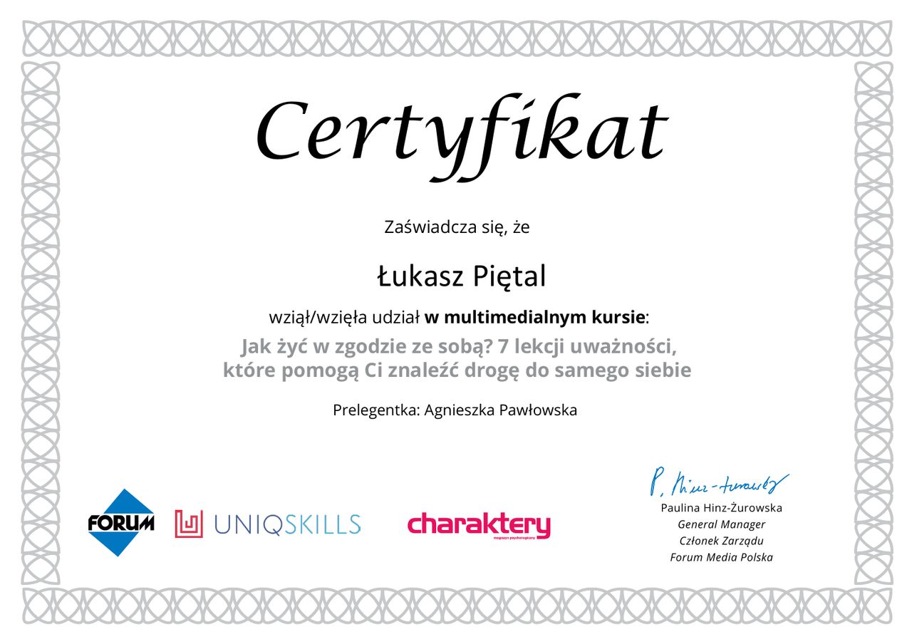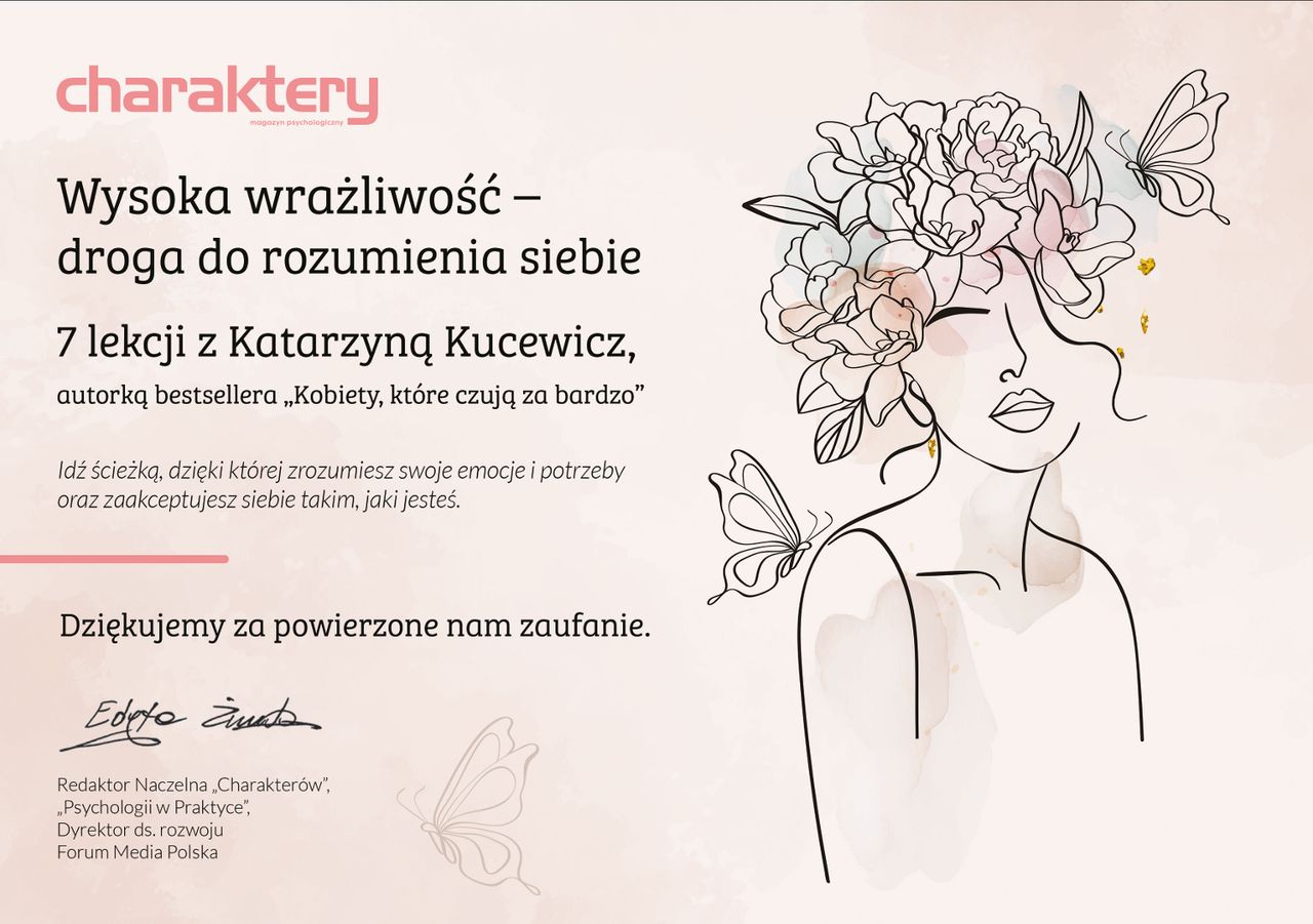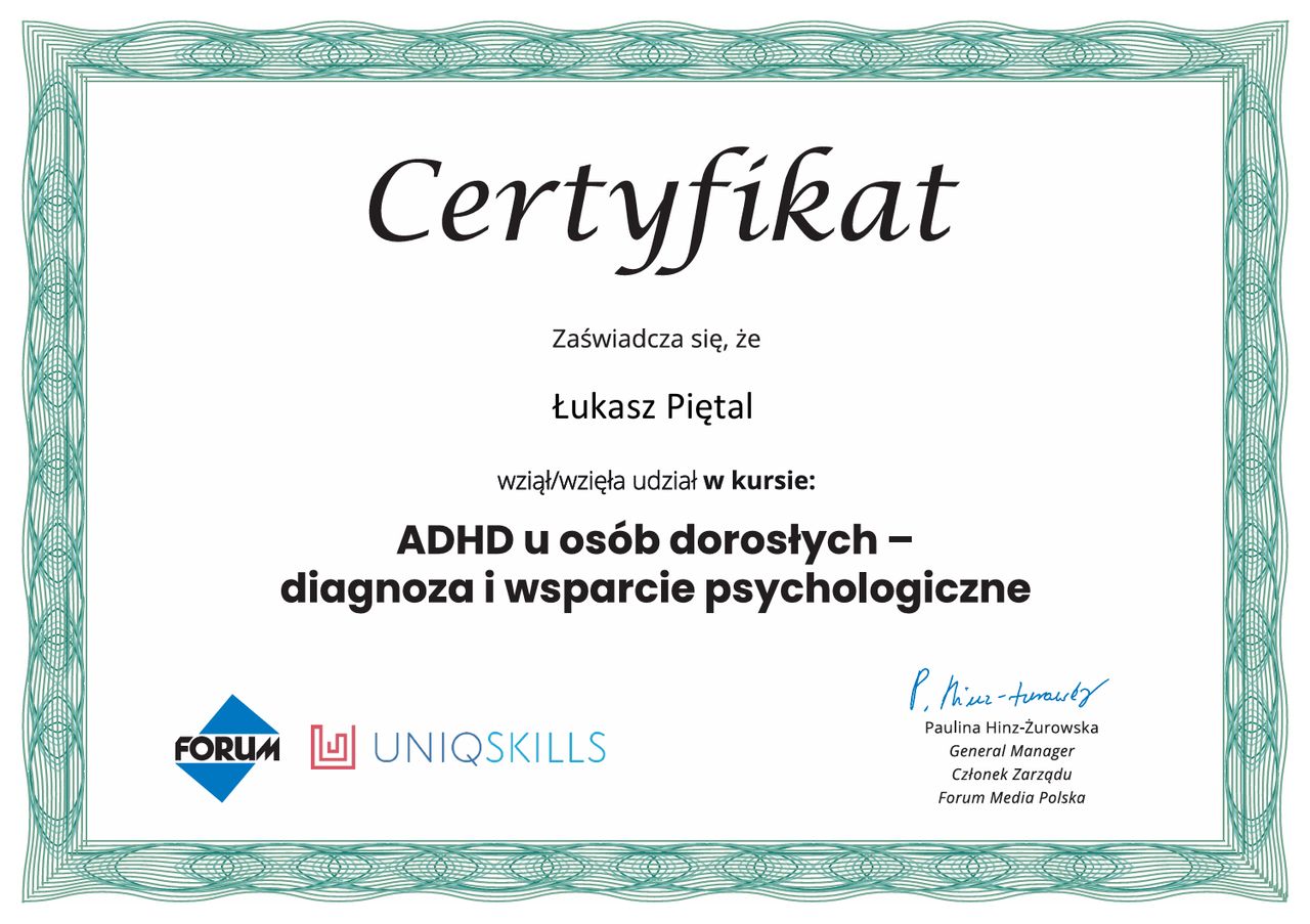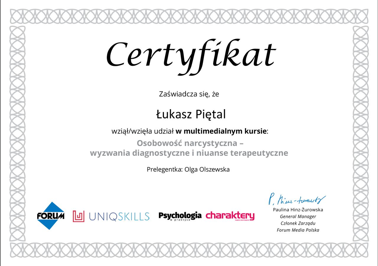 Stale poszerzam swoje kompetencje, biorąc udział w licznych certyfikowanych kursach z zakresu psychoterapii, takich jak: Diagnoza i pomoc psychologiczna osobom z depresją i obniżeniem nastroju Terapia lęku, załamania nerwowego i wyczerpania emocjonalnego Time Perspective Therapy wykorzystywana w pracy z PTSD Praca z zaburzeniami osobowości w gabinecie psychologa i psychoterapeuty Osobowość narcystyczna – wyzwania diagnostyczne i niuanse terapeutyczne Skuteczne metody terapii uzależnień na miarę XXI wieku Diagnoza i terapia zaburzeń przywiązania we współczesnej praktyce psychologicznej Wysoka wrażliwość – droga do rozumienia siebie Jak pracować z pacjentem z natręctwami religijnymi? Religia i duchowość w psychoterapii Praca z natręctwami w gabinecie psychoterapeuty.