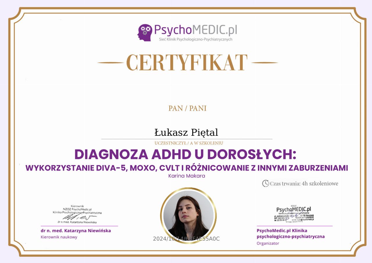 w diagnozie i terapii ADHD u dorosłych oraz wsparciu psychologicznym kobiet na każdym etapie okresu okołoporodowego. Pomagam w radzeniu sobie z trudnościami emocjonalnymi, lękiem, obniżonym nastrojem, kryzysami oraz depresją poporodową. W pracy z kobietami w tym szczególnym czasie łączę wiedzę z zakresu psychoterapii oraz podejście integracyjne, dbając o bezpieczeństwo, zrozumienie i profesjonalizm.