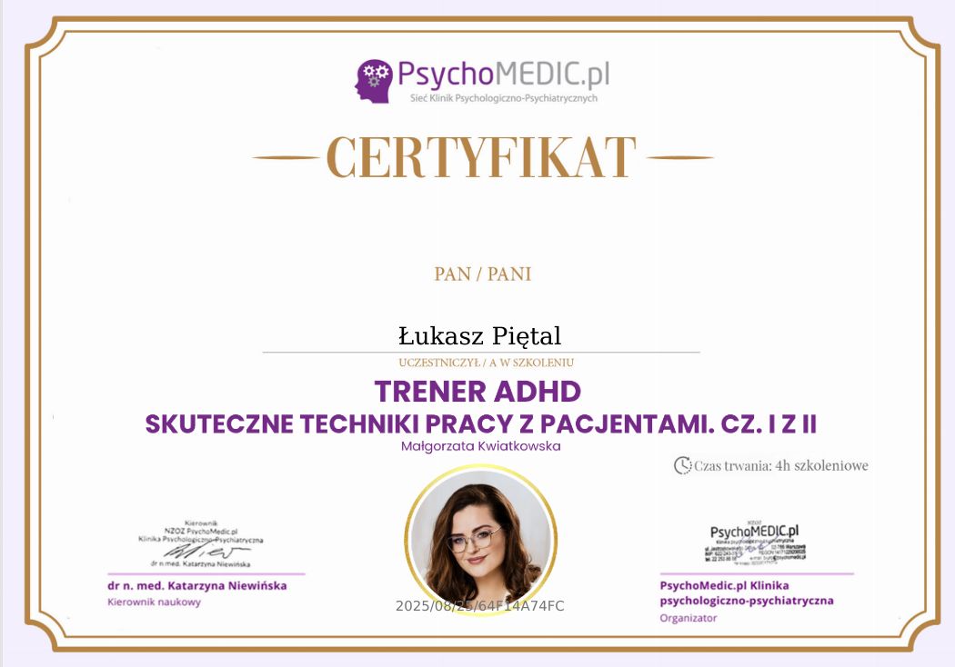 Po kilkumiesięcznej terapii psychodynamicznej, która trochę mi pomogła, jednak zacząłem szukać kogoś kto nie tylko będzie zadawał mi pytania. Jako osoba z ADHD potrzebowałem kogoś kto wysłucha, zrozumie, wytłumaczy ale też podpowie. Pan Łukasz zdecydowanie rozumie, wyjaśnia i daje narzędzia do pracy nad własnym zdrowiem psychicznym. Cieszę się, że na Pana trafiłem. Dziękuję.