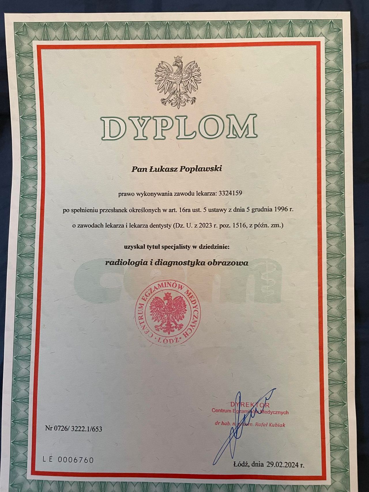 Dr n. med. Łukasz Popławski to doświadczony radiolog, absolwent Uniwersytetu Medycznego w Białymstoku. Swoje umiejętności kliniczne rozwijał w prestiżowych placówkach, m.in. w Uniwersyteckim Szpitalu Klinicznym w Białymstoku, Wojewódzkim Szpitalu Zespolonym im. J. Śniadeckiego oraz w szpitalach w Grajewie, Ostrowi Mazowieckiej i Łapach. Posiada szerokie doświadczenie w diagnostyce ultrasonograficznej oraz badaniach dopplerowskich.