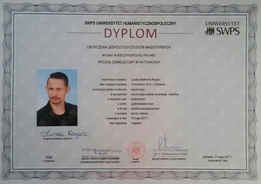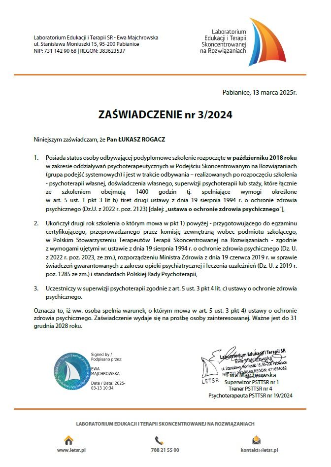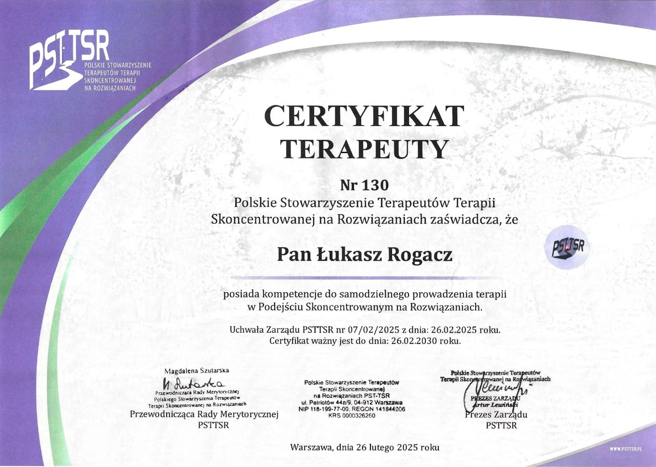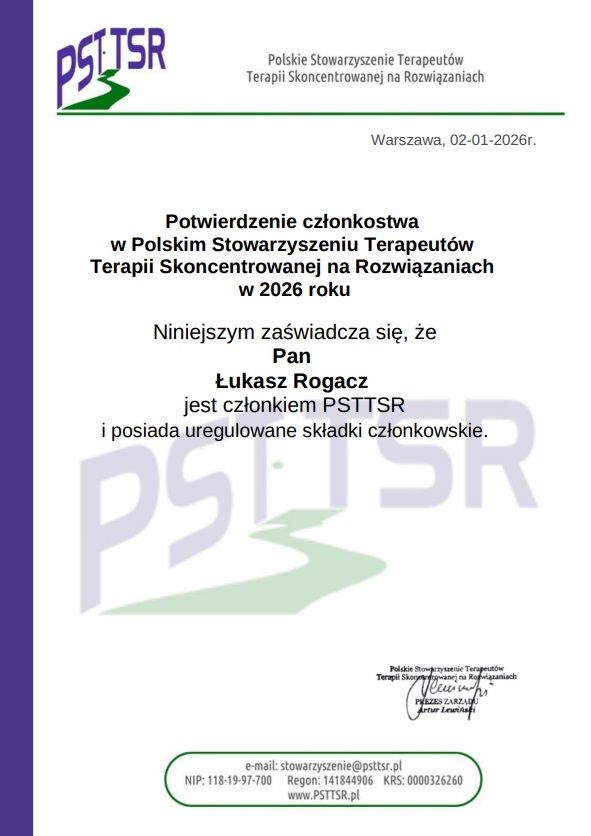 Nazywam się Łukasz Rogacz. Jestem psychologiem, certyfikowanym terapeutom TSR (Certyfikat nr 130) oraz psychoterapeutom TSR w procesie certyfikacji. Uczestniczę regularnie w szkoleniach specjalistycznych akredytowanych przez Polskie Stowarzyszenie Terapeutów Terapii Skoncentrowanej na Rozwiązaniach (PSTTSR). Jestem członkiem tego stowarzyszenia i pracuję pod stałą superwizją Pani Magdaleny Szutarskiej – certyfikowanej psychoterapeutki i superwizorki PSTTSR.